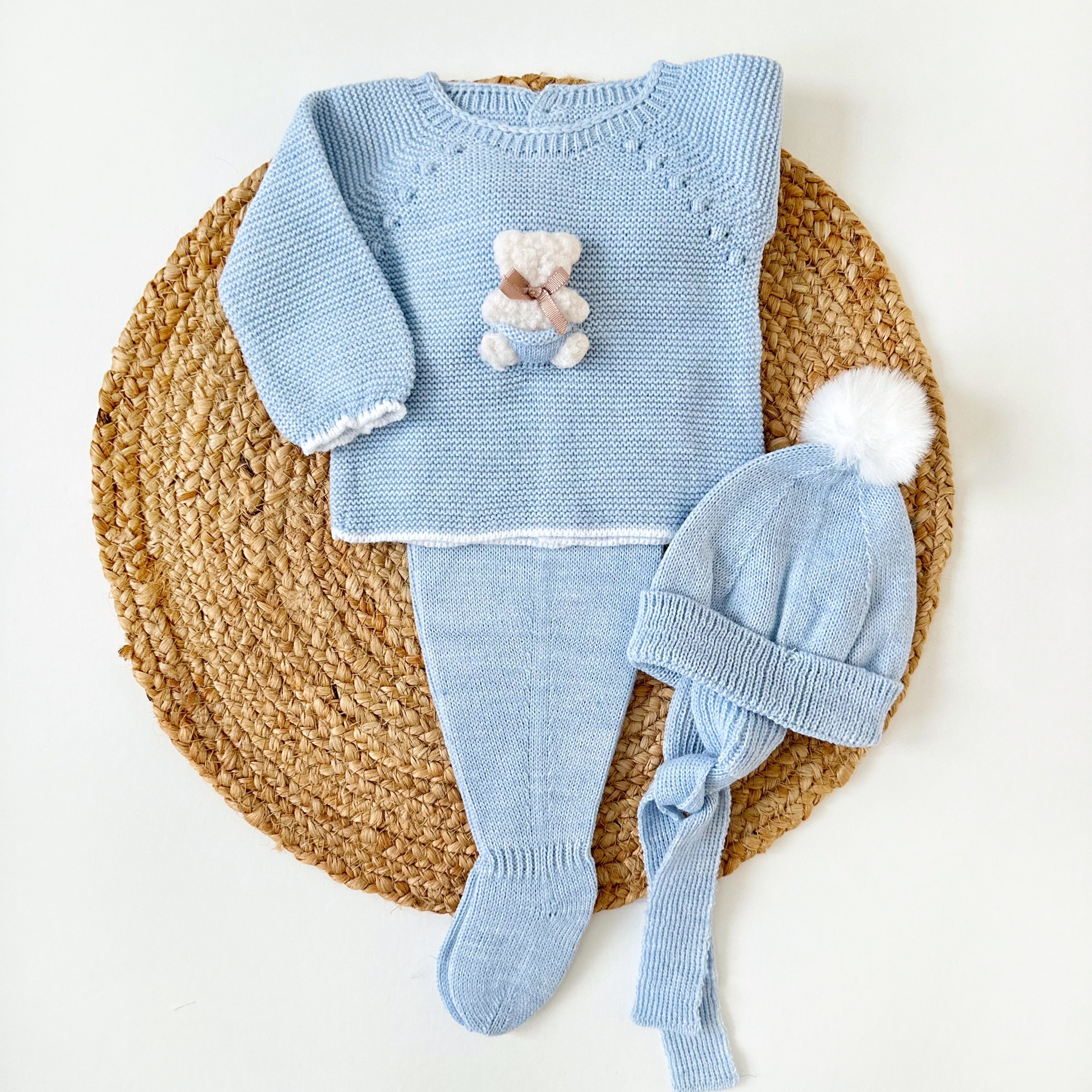 • Three pieces are included: Sweater, pants and bonnet