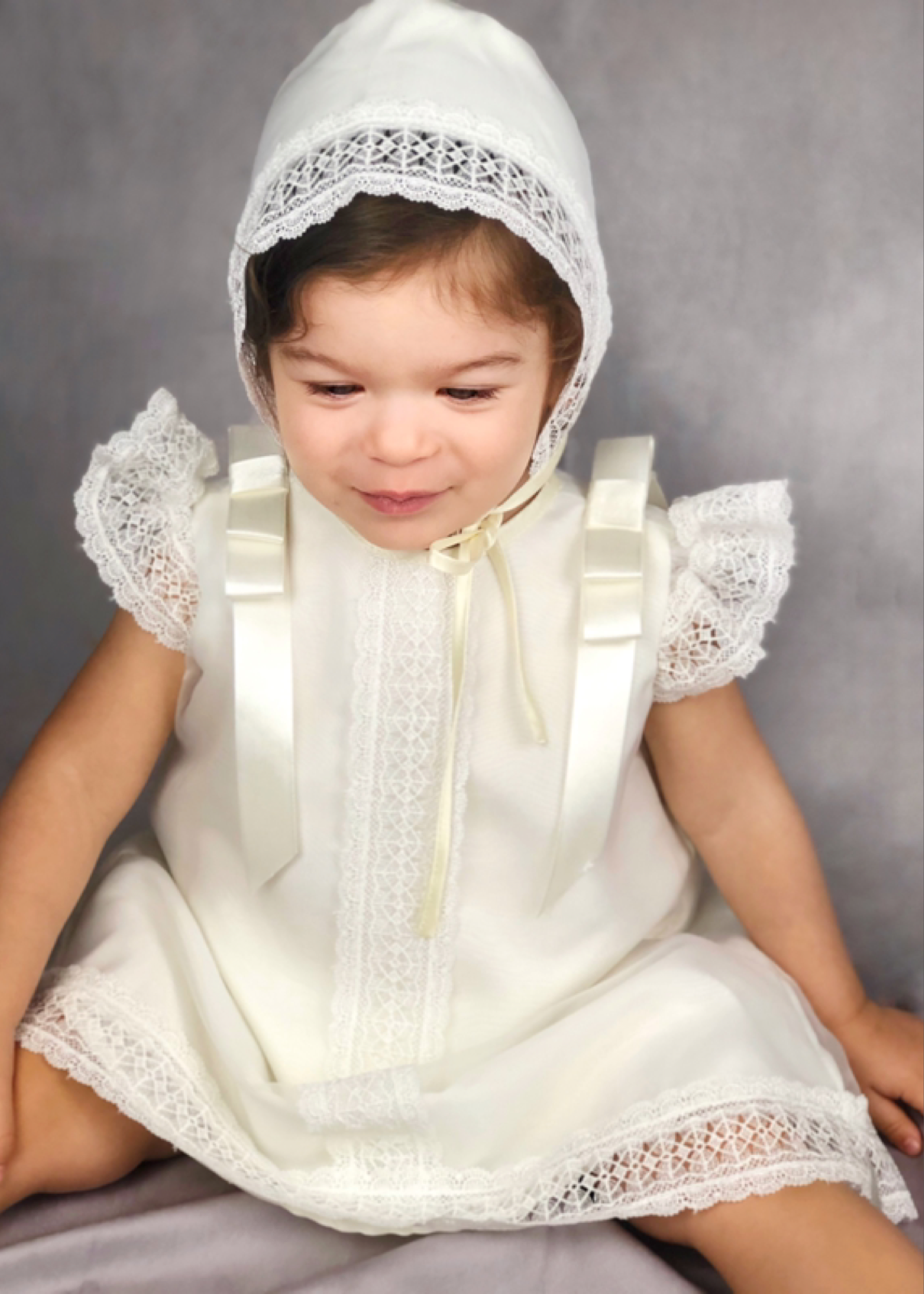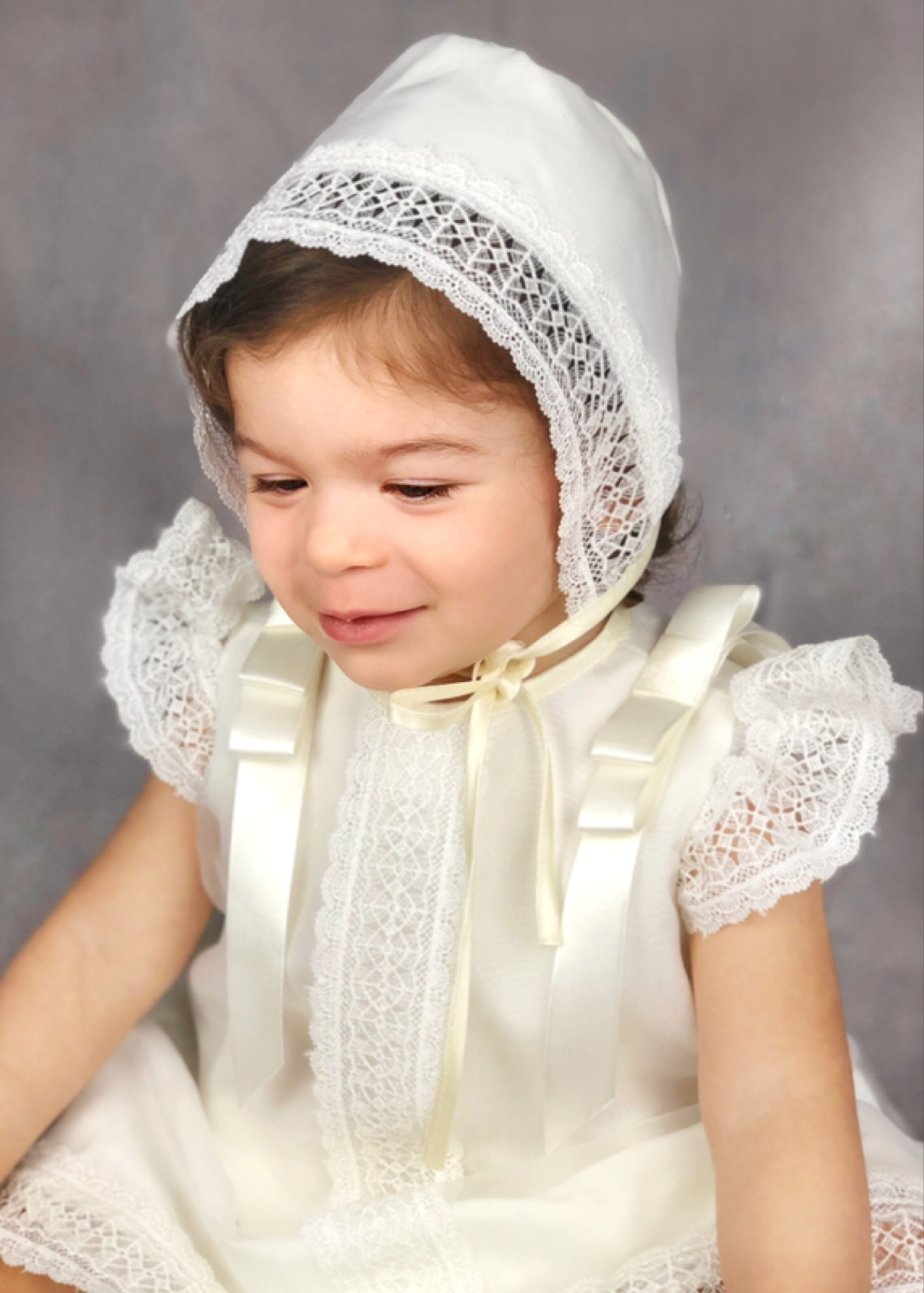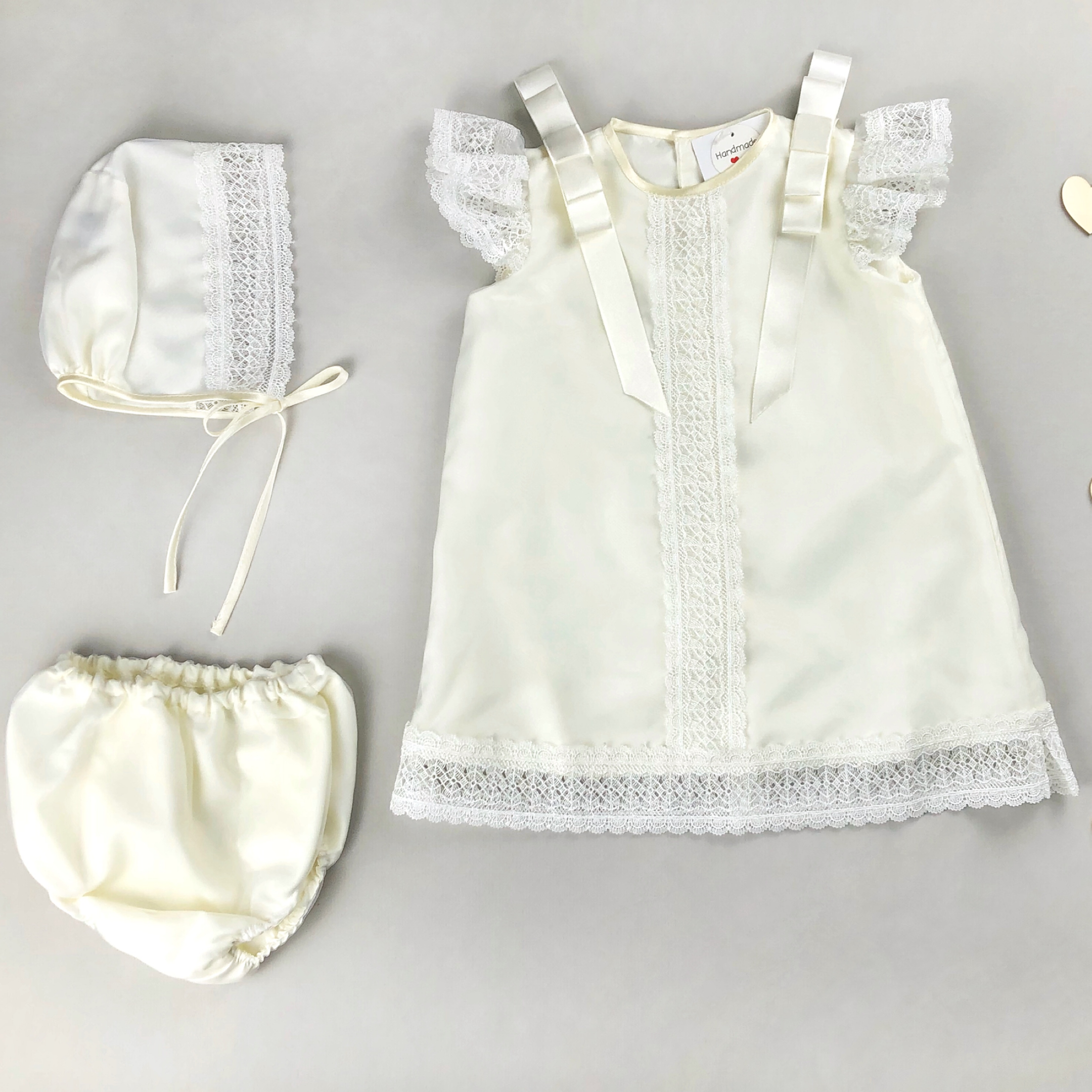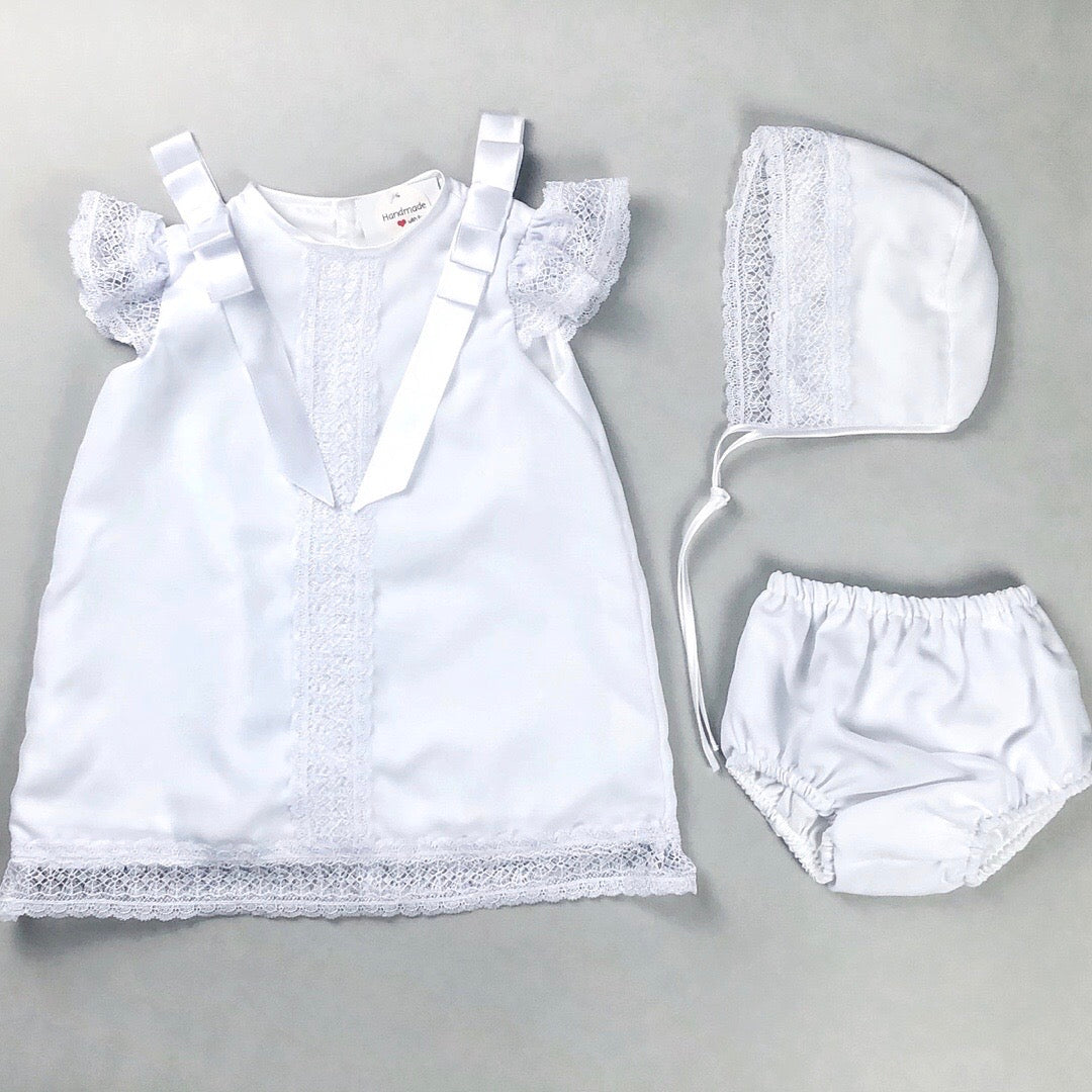 Three pieces are included: Dress, bonnet and underwear until size 24M