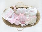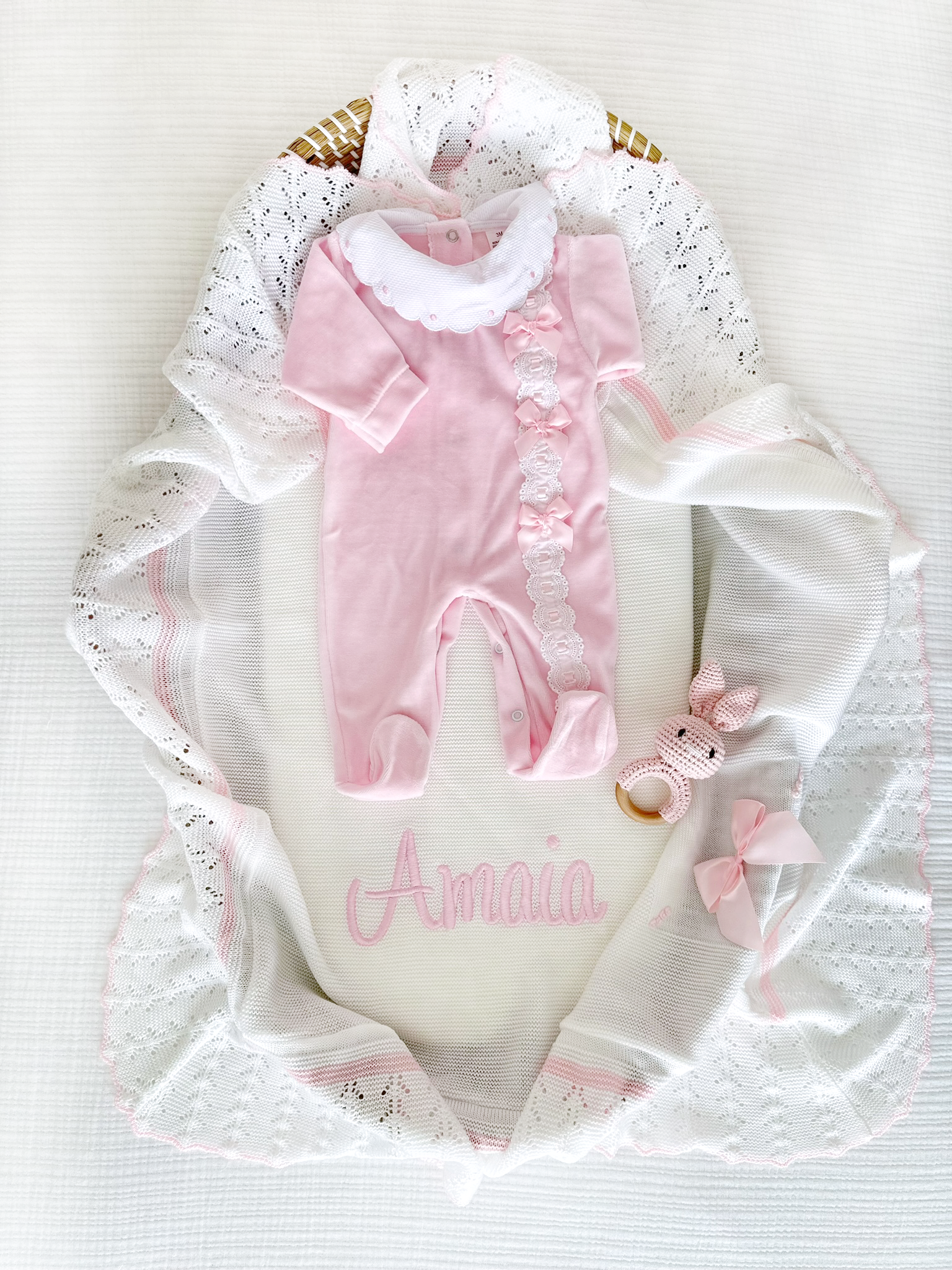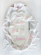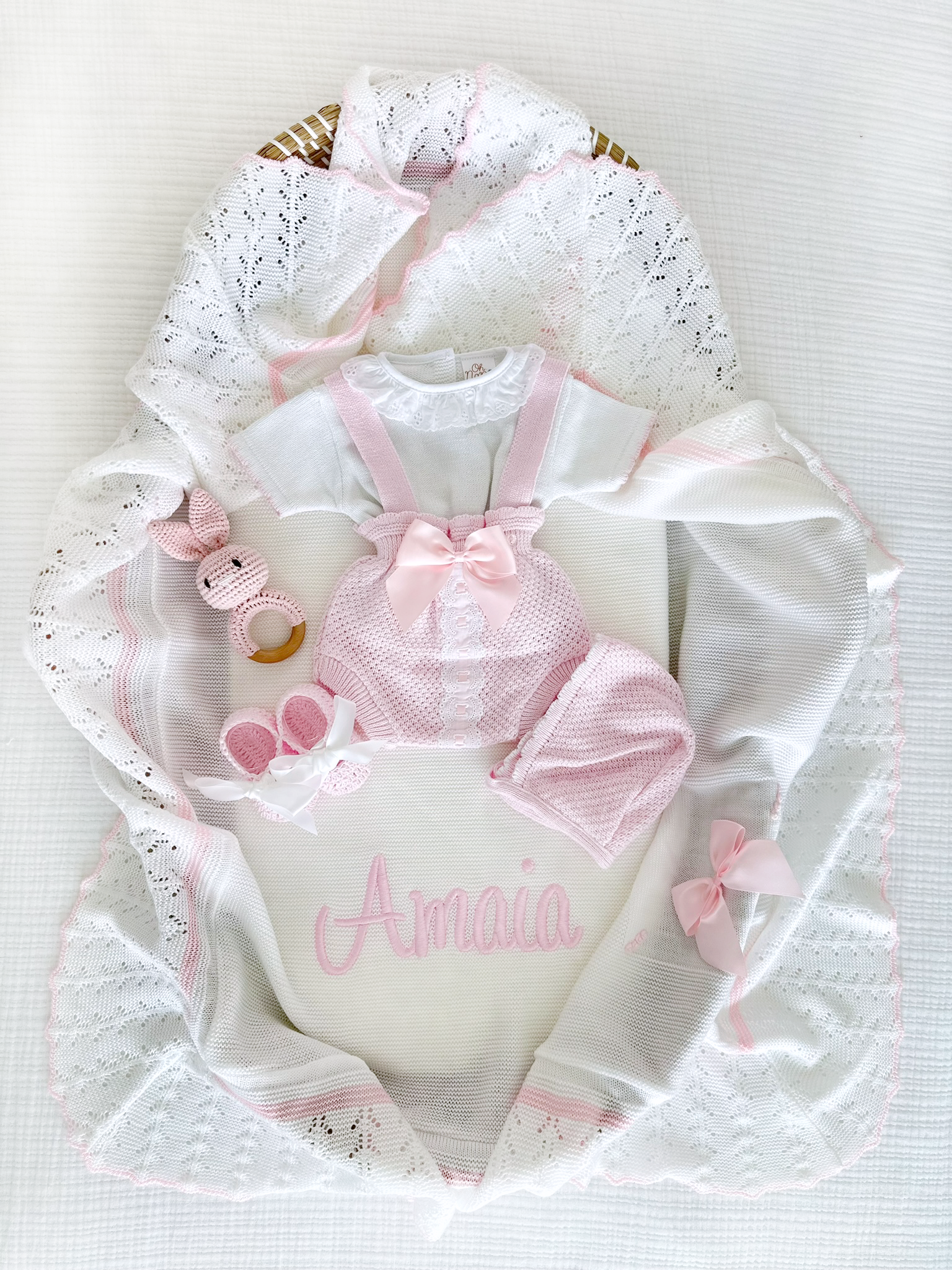 • Three Outfits, Personalized Blanket and Bunny Rattle (Adriana 4 Piece Knitted Outfit Light Pink/White, Personalized Jennifer Three Piece Knitted Outfit White/Light Pink, Personalized Petals Knitted Blanket White/Light Pink, Velvet Pijama Light Pink, and Bunny Rattle.