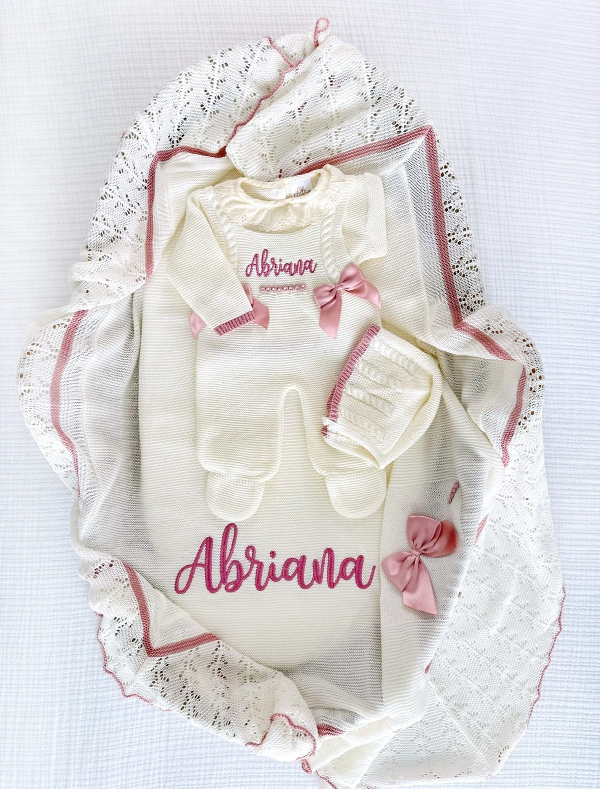 - Two Outfits, Personalized Blanket and Rattle (Adriana 4 Piece Knitted Outfit Dusty Pink/Ivory, Mony Three Piece Knitted Outfit Ivory-Dusty Pink, Personalized Petalo Knitted Blanket Ivory/Dusty Pink and Rattle.