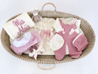 - Three Outfits, Personalized Blanket and Bunny Rattle (Adriana 4 Piece Knitted Outfit Dusty Pink/Ivory, Nenny Three Piece Knitted Outfit Dusty Pink/Ivory, Personalized Gala Knitted Blanket Ivory/Dusty Pink, Velvet Pijama Dusty Pink, and Reindeer Rattle.