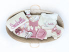 • Two Outfits, Personalized Blanket and Matching Rattle (Flowers 4 Piece Knitted Outfit Ivory/Dusty Pink, Butterfly Three Piece Knitted Outfit Dusty Pink/Ivory, Personalized Flowers Knitted Blanket Dusty Pink/Ivory and Matching Rattle.