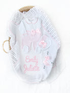 - Four pieces are included: sweater, jumpsuit, bonnet and Flowers personalized blanket