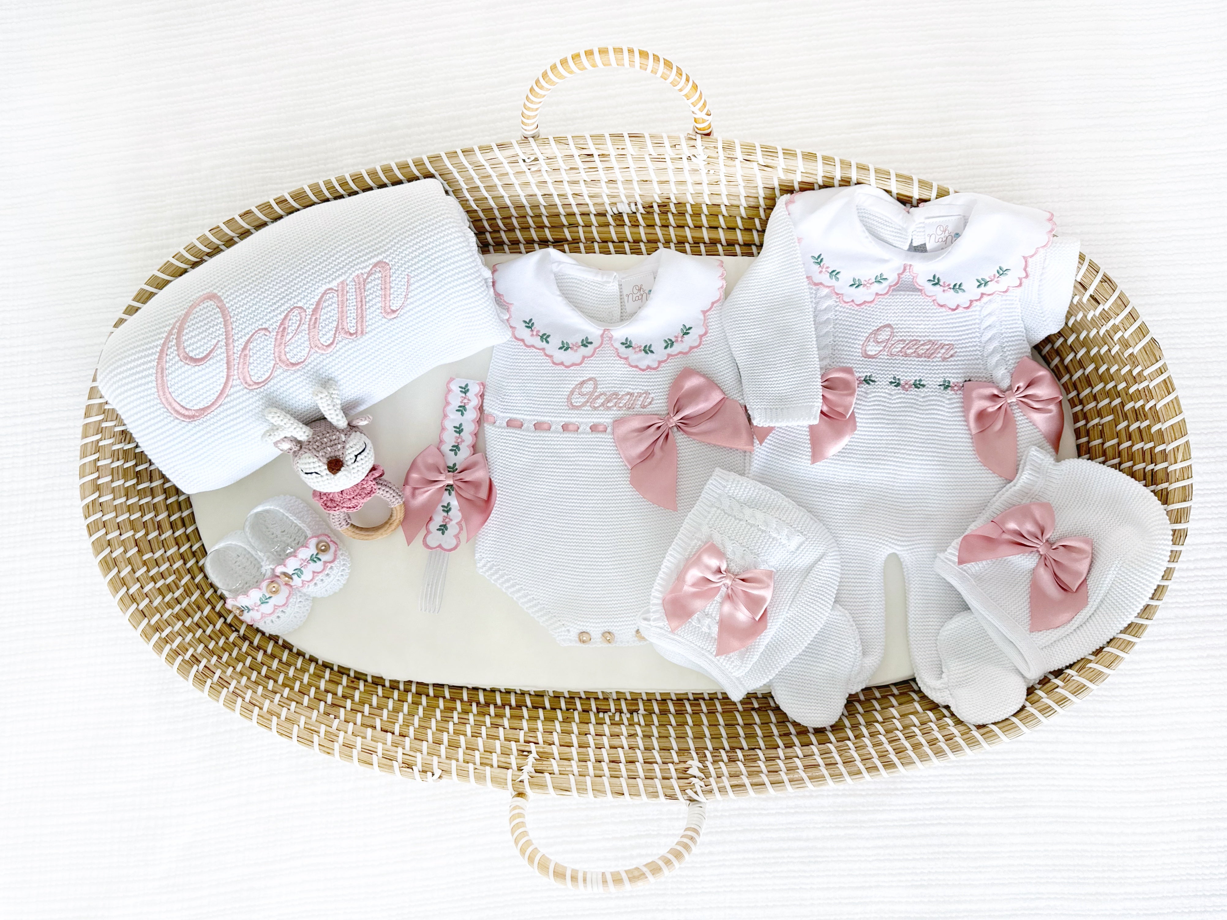 • Two Outfits, Personalized Blanket and Rattle (Flowers 4 Piece Knitted Outfit White/Dusty Pink, Flowers Three Piece Knitted Outfit White/Dusty Pink, Personalized Flowers Knitted Blanket White/Dusty Pink and Matching Rattle.