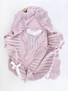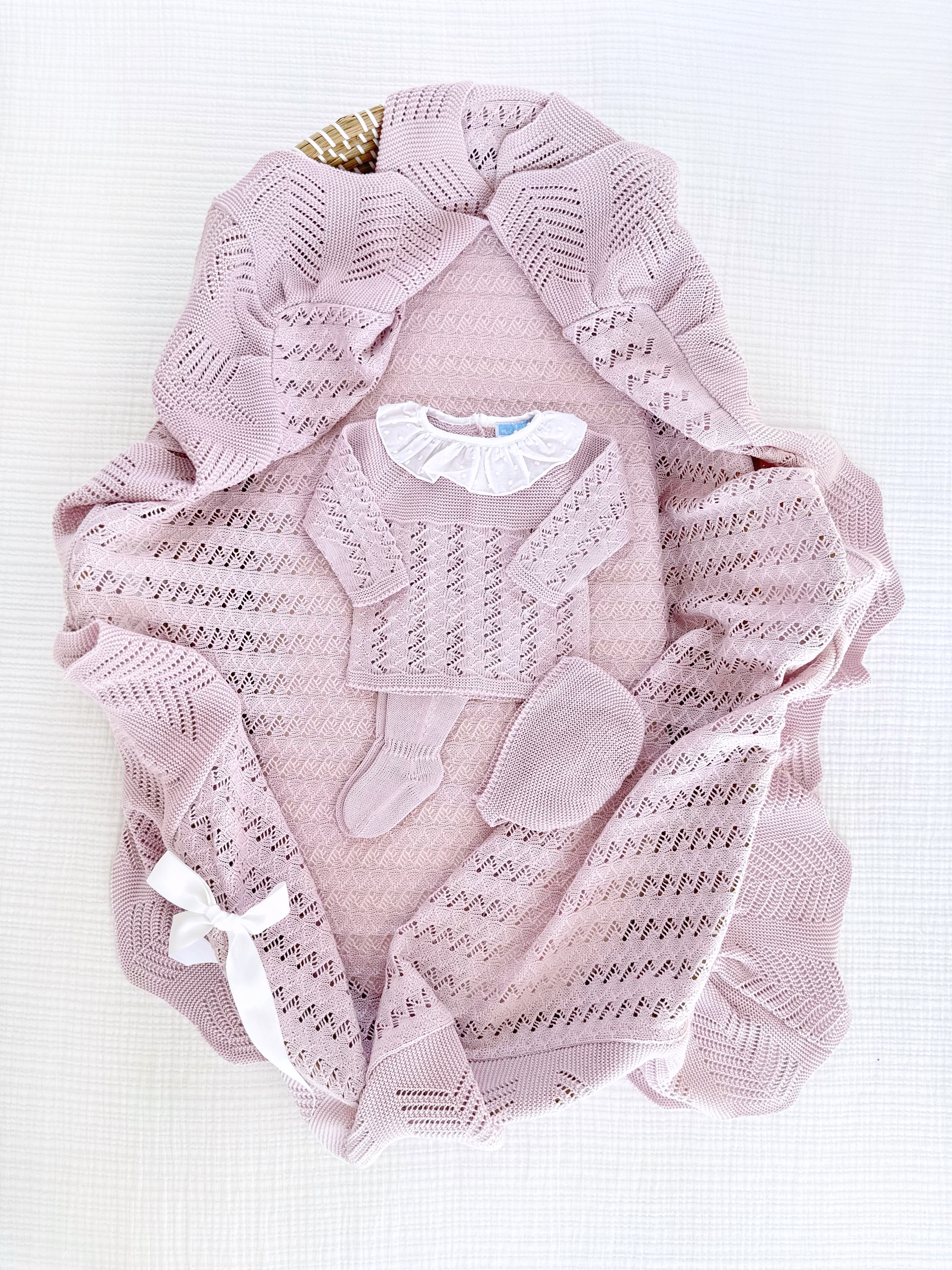 • Four pieces are included: sweater, pants, bonnet and blanket