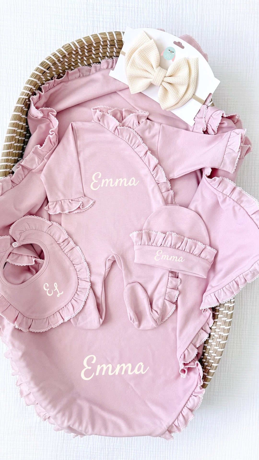 • Five piece included: Pajama, hat, bib, blanket and matching bow.