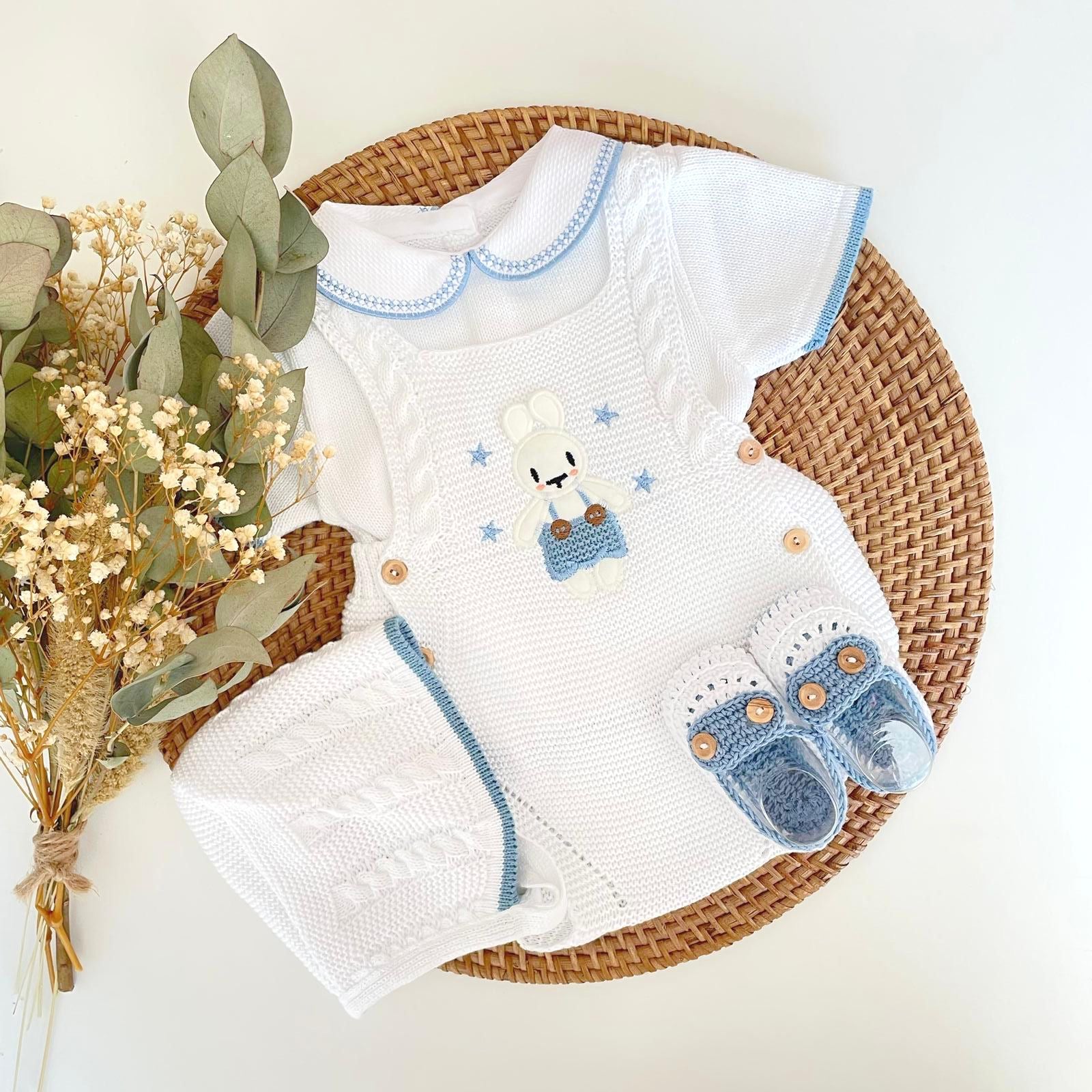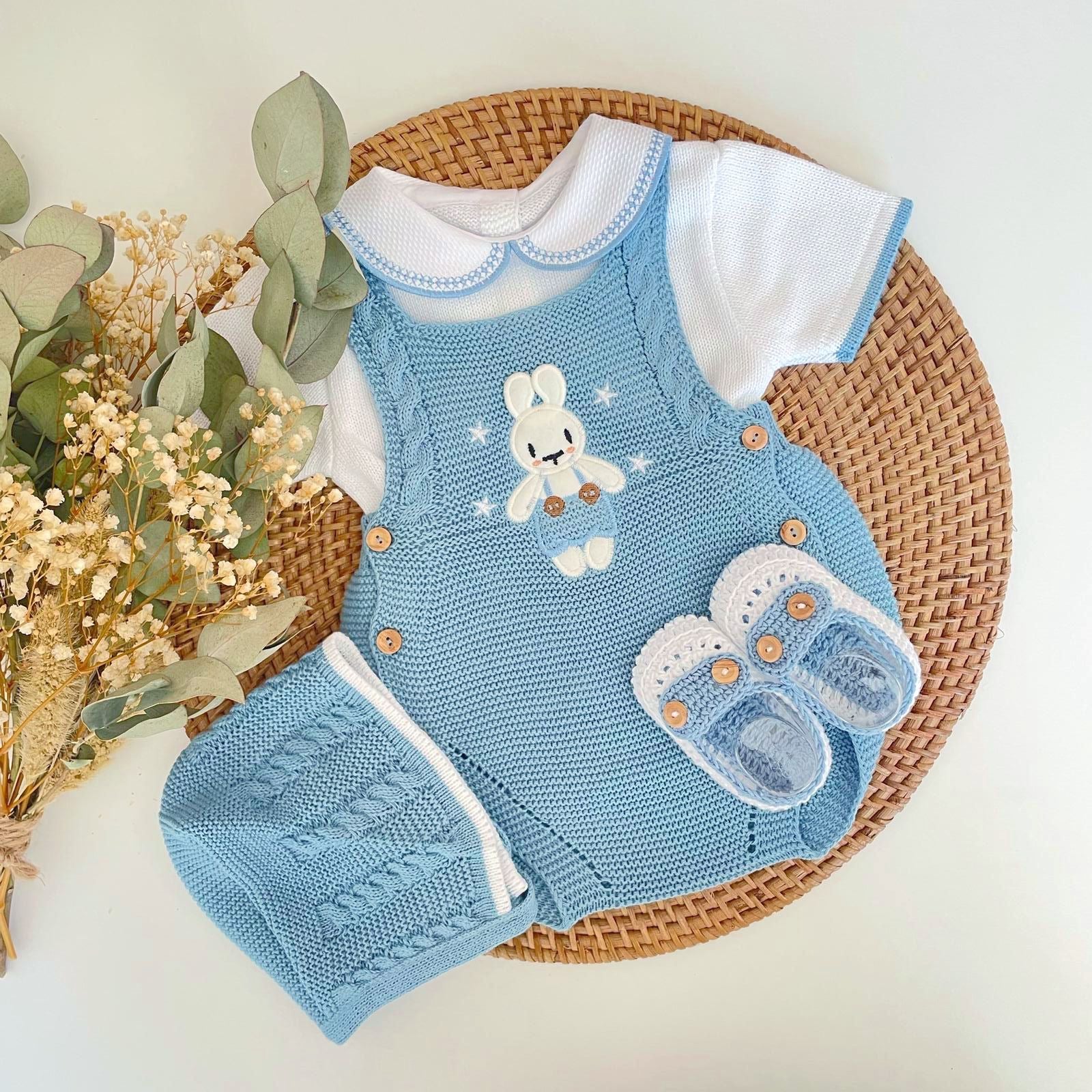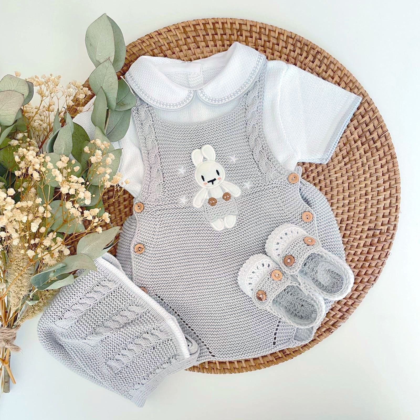 - Four pieces are included: Romper, shirt, knitted shoes and bonnet