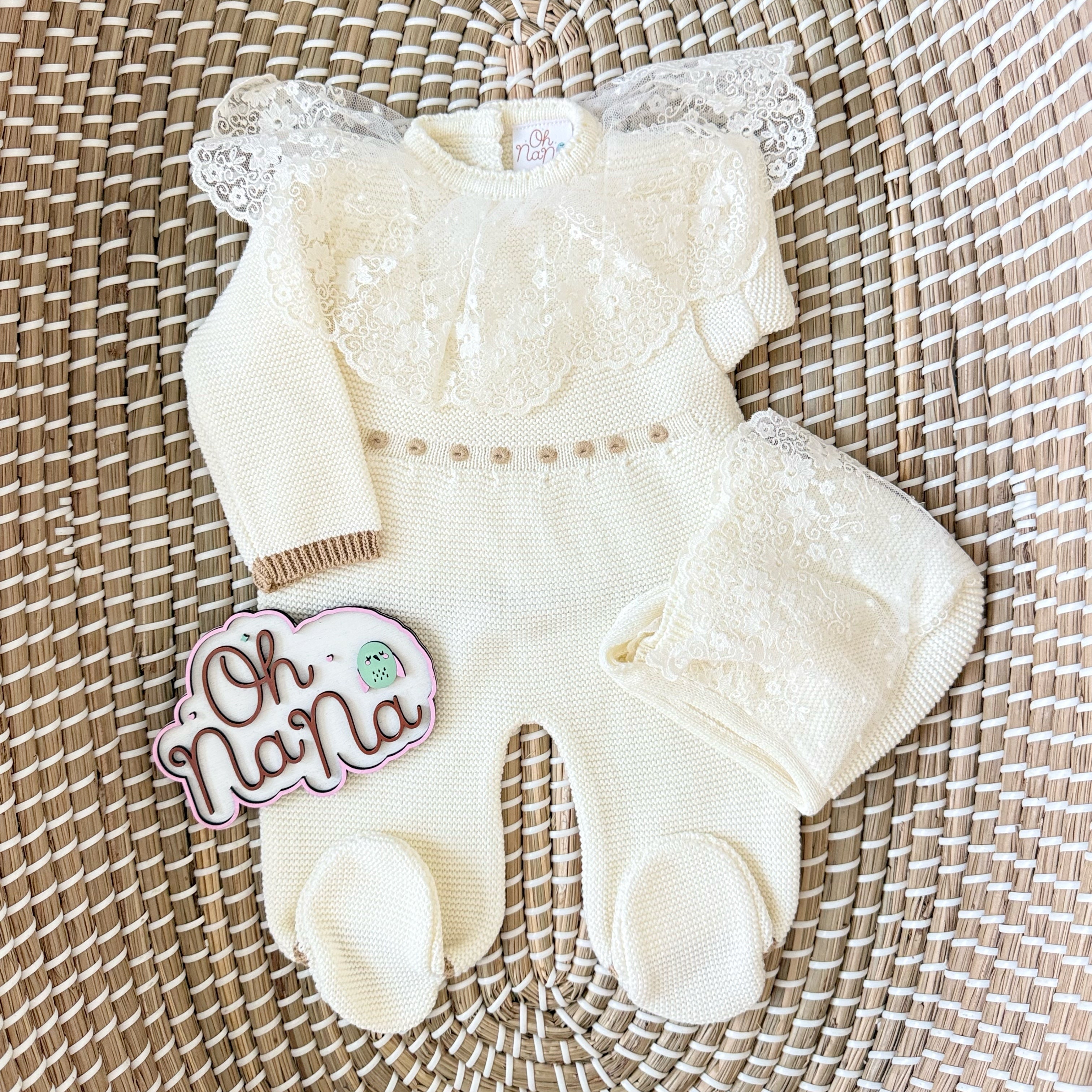 - Knitted Jumpsuit, Bonnet and Blanket.