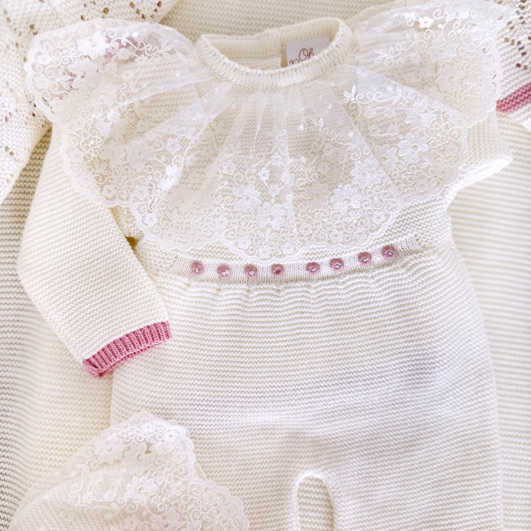 - Knitted Jumpsuit, Bonnet, Shoes and Blanket.