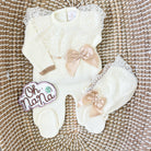 - Knitted Jumpsuit, Bonnet and Blanket.