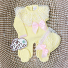 - Knitted Jumpsuit, Bonnet and Blanket.