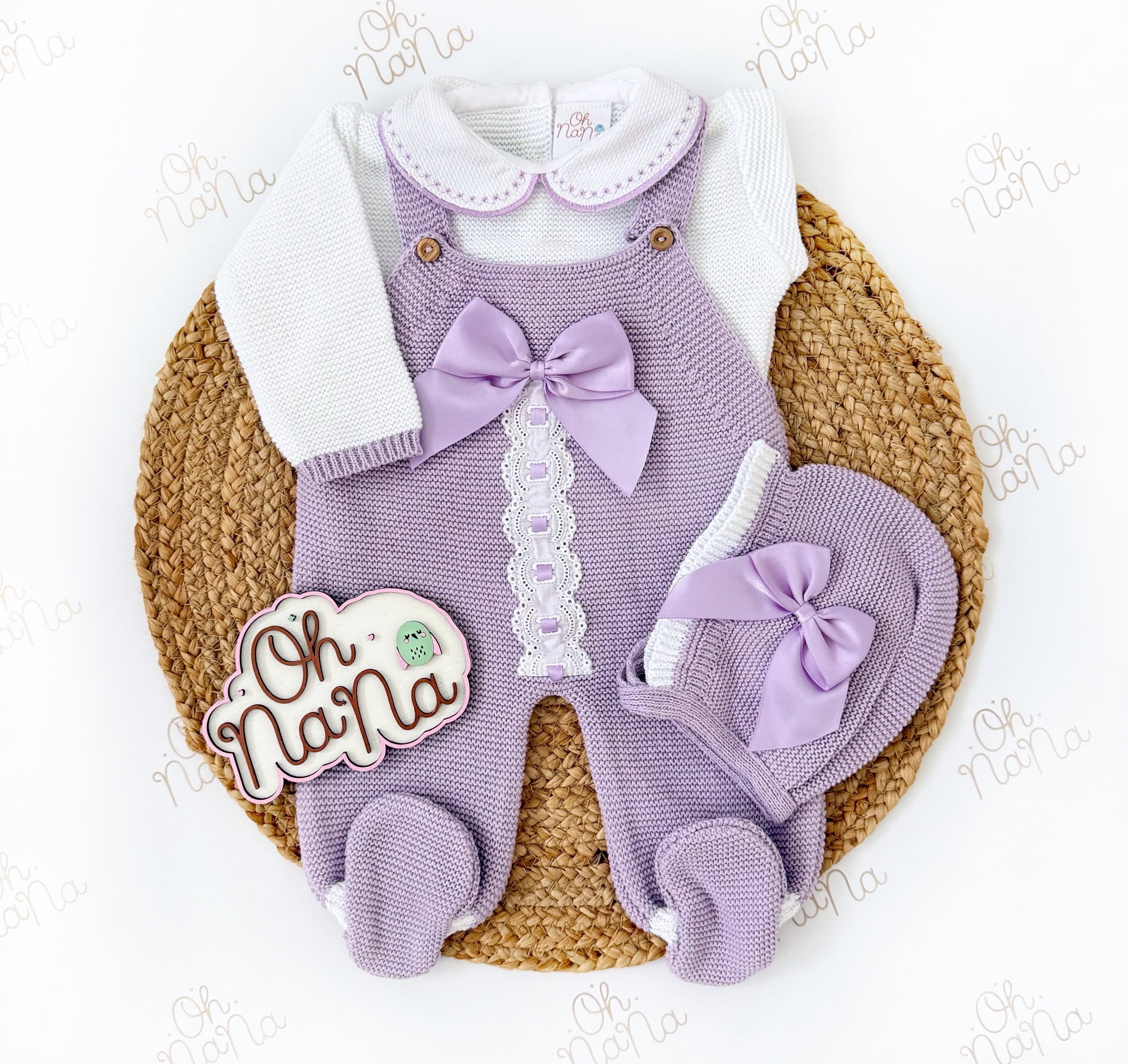 - Four pieces are included: Romper, shirt, knitted shoes and bonnet