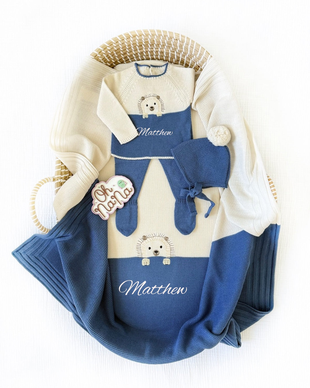 - Four pieces are included: sweater, pants, bonnet and matching blanket