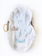 - Four pieces are included: sweater, romper, bonnet and Petalo personalized blanket
