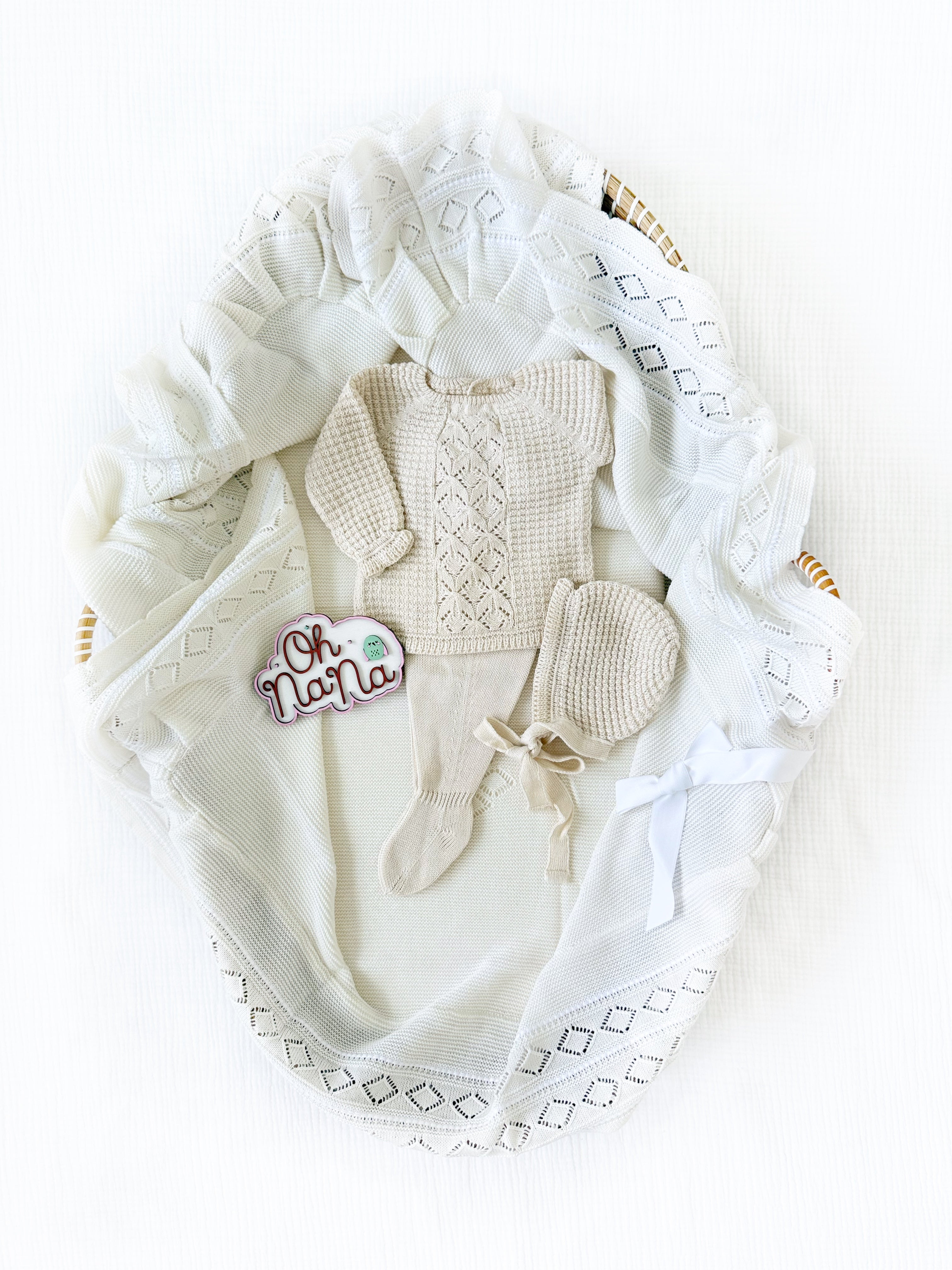 - Four pieces are included: sweater, pants, bonnet and matching blanket