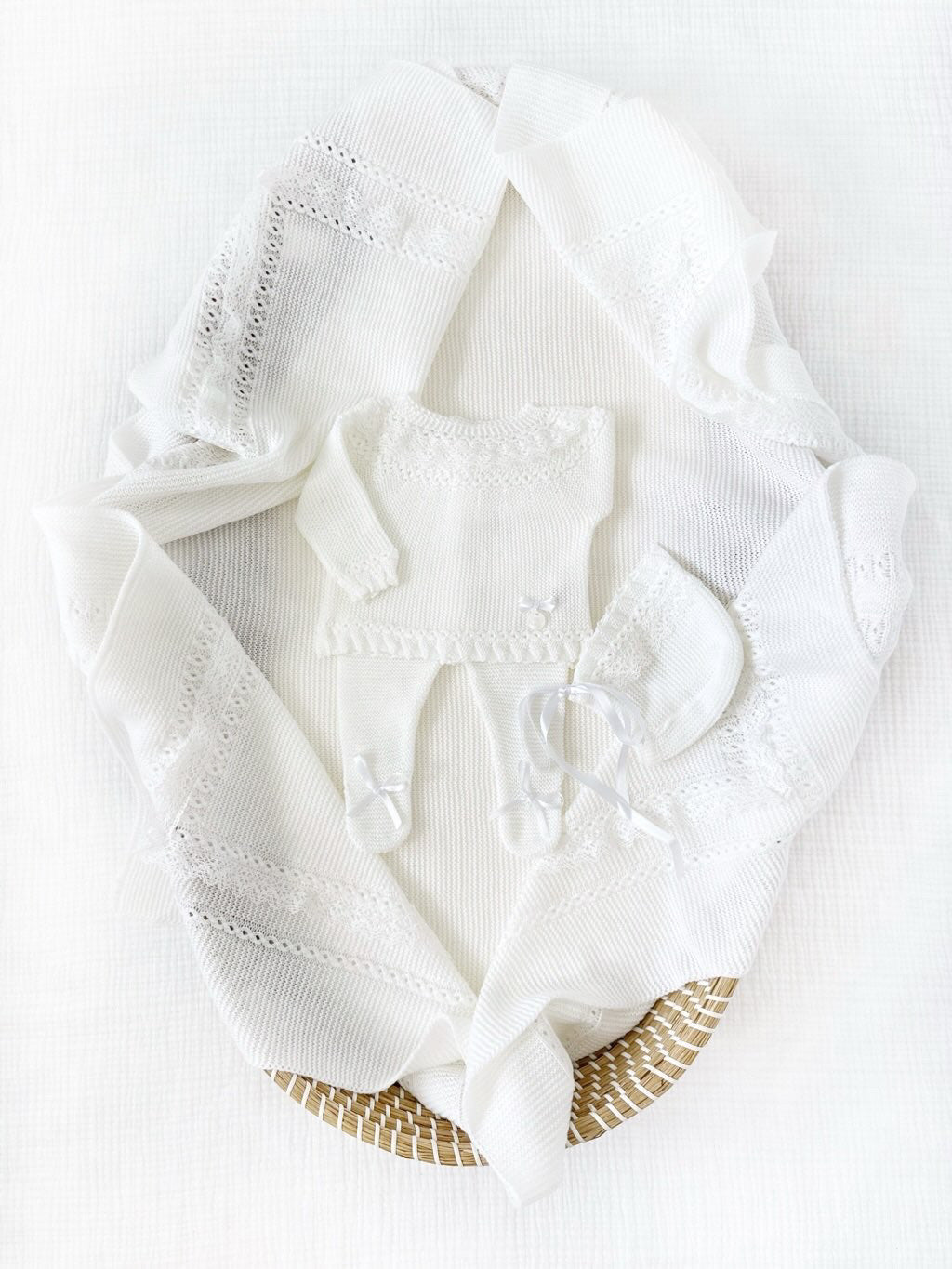 • Four pieces are included: sweater, pants, bonnet and personalized blanket
