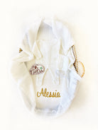 - Four pieces are included: sweater, pants, bonnet and personalized blanket