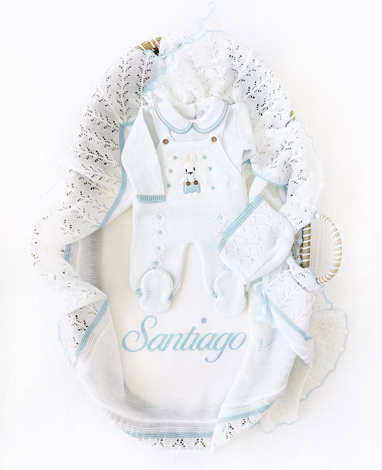 Sweet Bunny Outfit + Personalized Blanket Set (White/Light Blue)