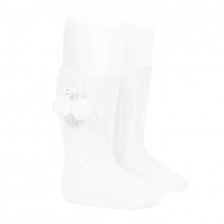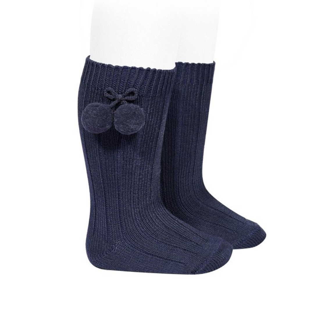 Warm Cotton Rib Knee-High Socks with Pompoms (Navy)