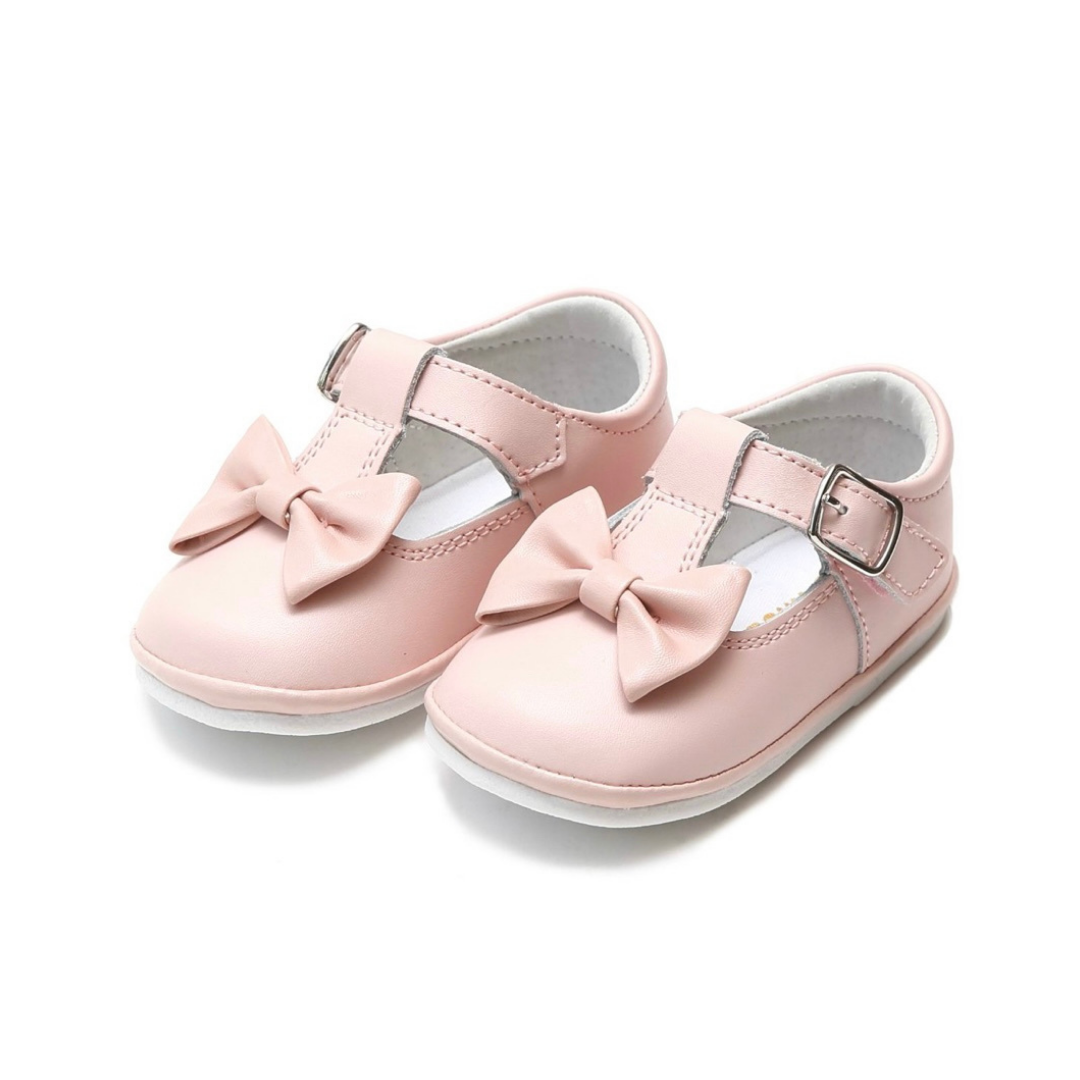 • T-strap style with bow accent