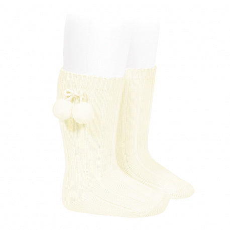 Warm Cotton Rib Knee-High Socks with Pompoms (Ivory)