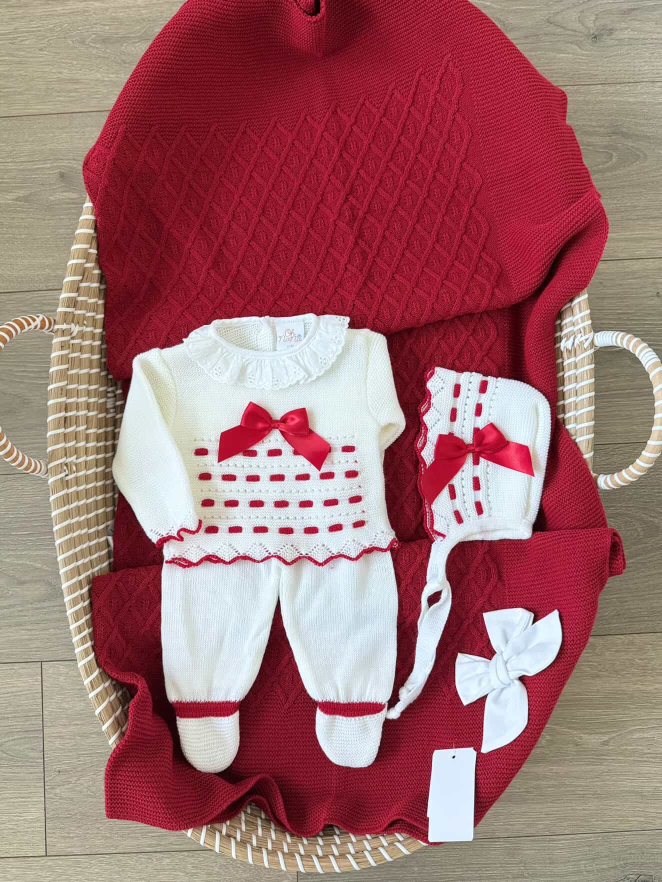 - Four pieces are included: sweater, pants, bonnet and matching blanket