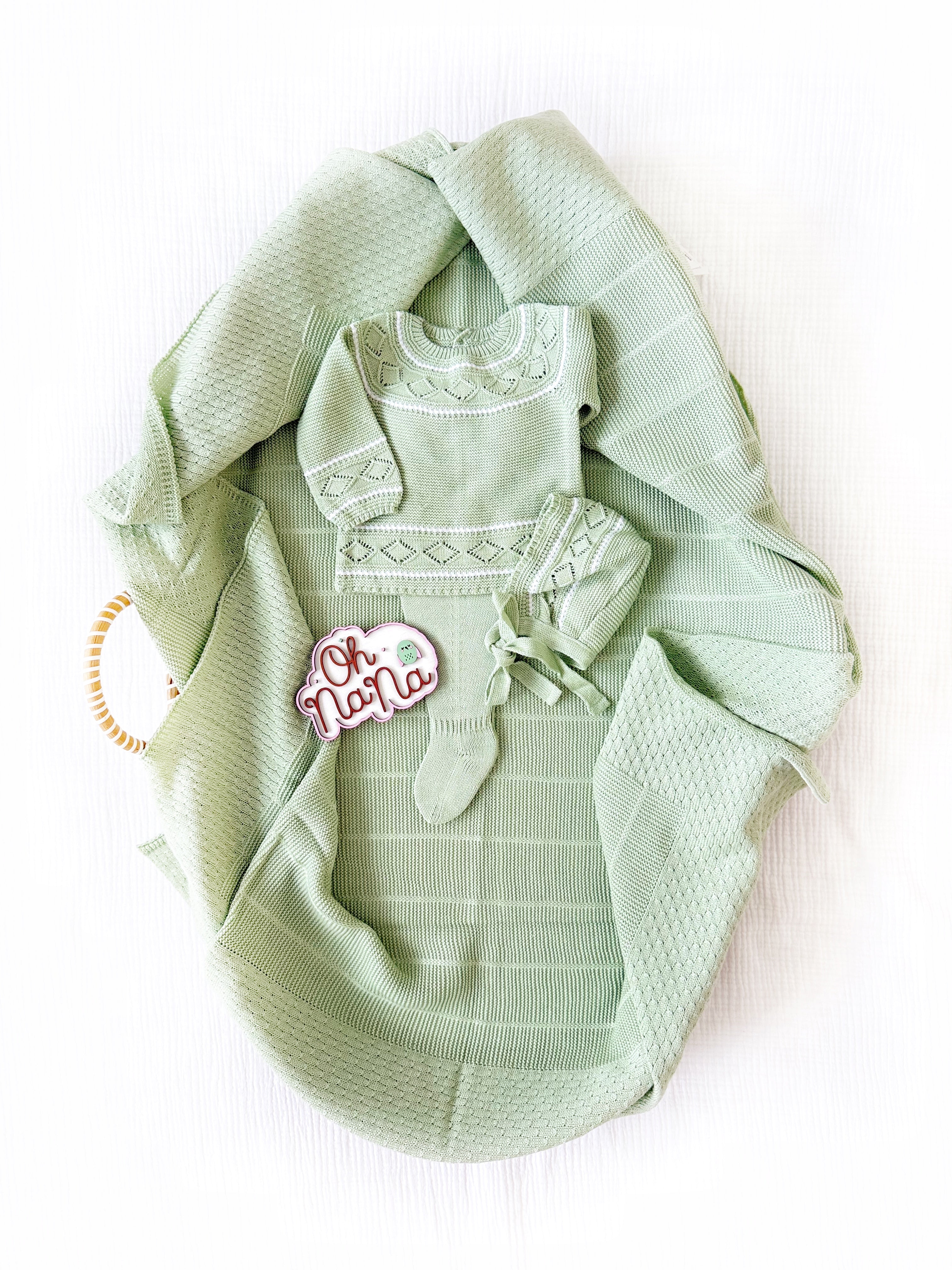 - Four pieces are included: sweater, pants, bonnet and matching blanket