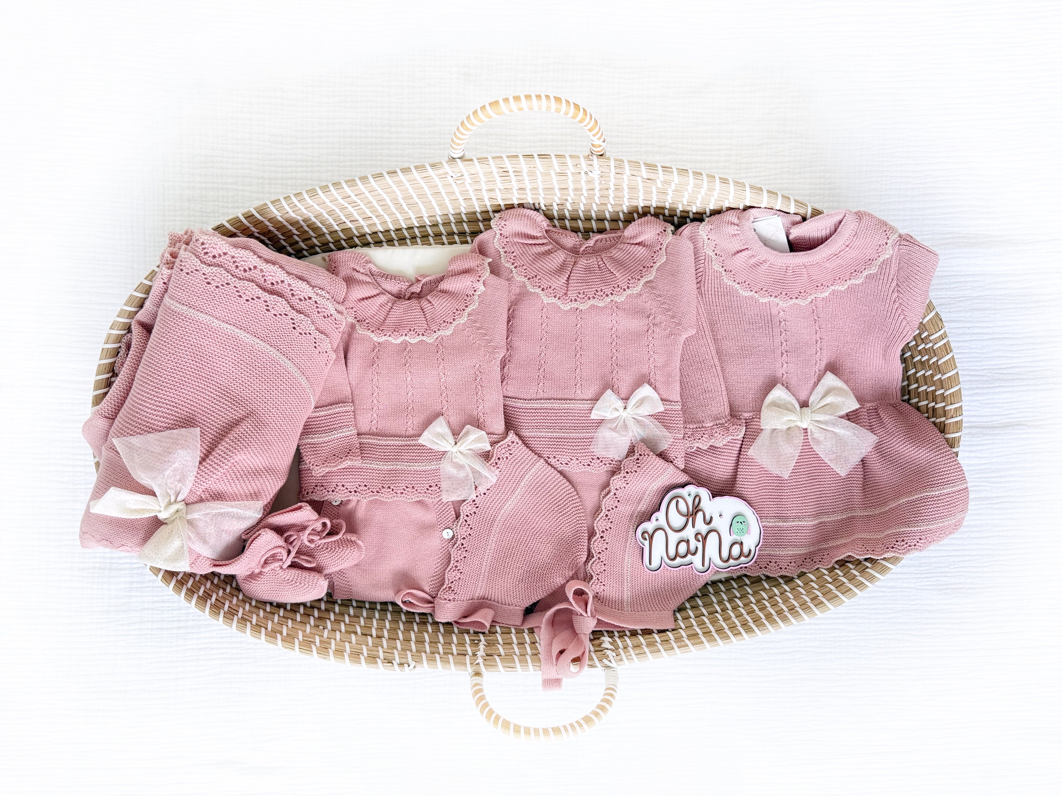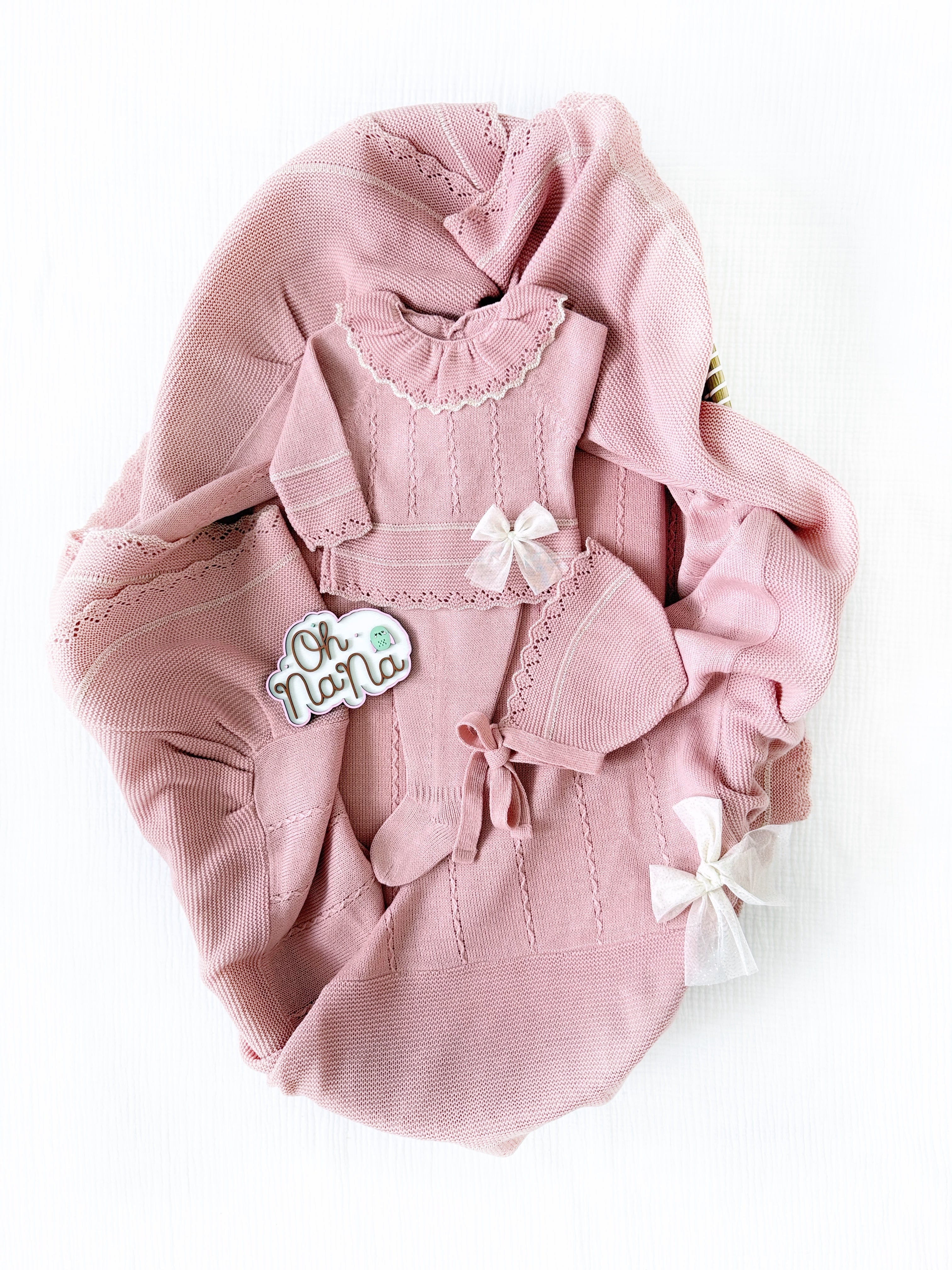 - Three Piece Outfit Size Newborn, Four Piece Outfit Size Newborn, Knitted Dress size 3 Months, matching blanket.