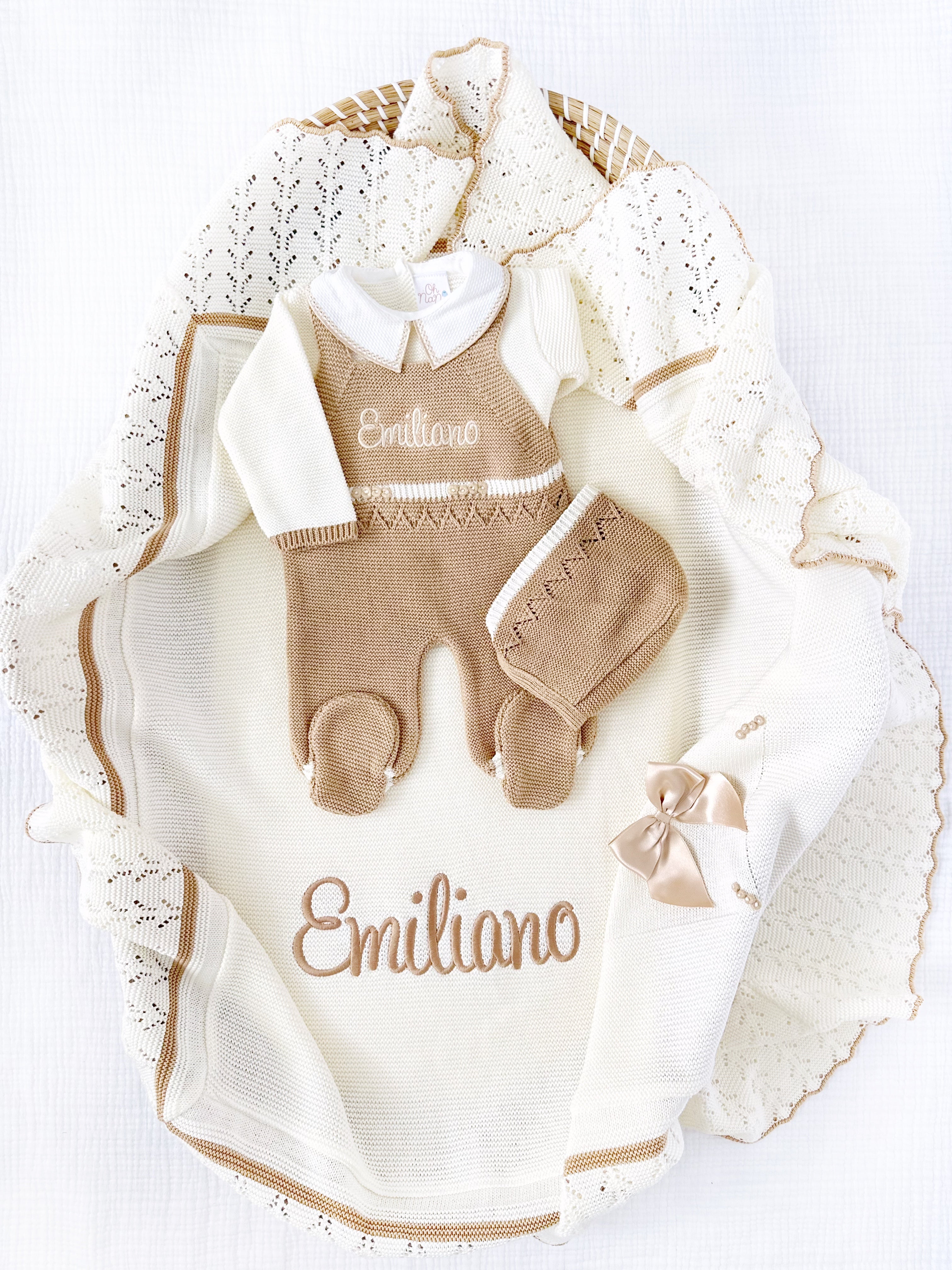 - Four pieces are included: sweater, romper, bonnet and Petalo personalized blanket