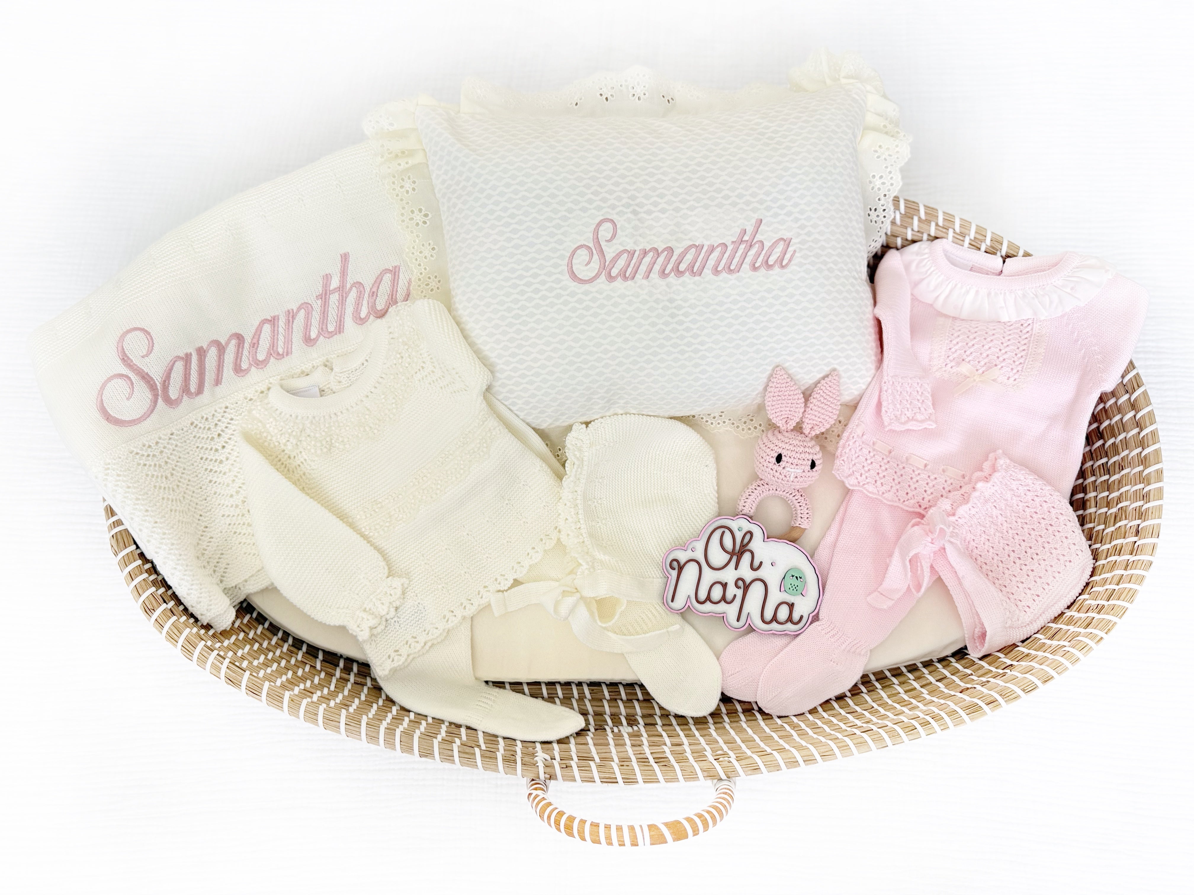 - Pieces are included: Two Outfits with bonnet, personalized matching blanket, personalized pillow and a matching rattle.