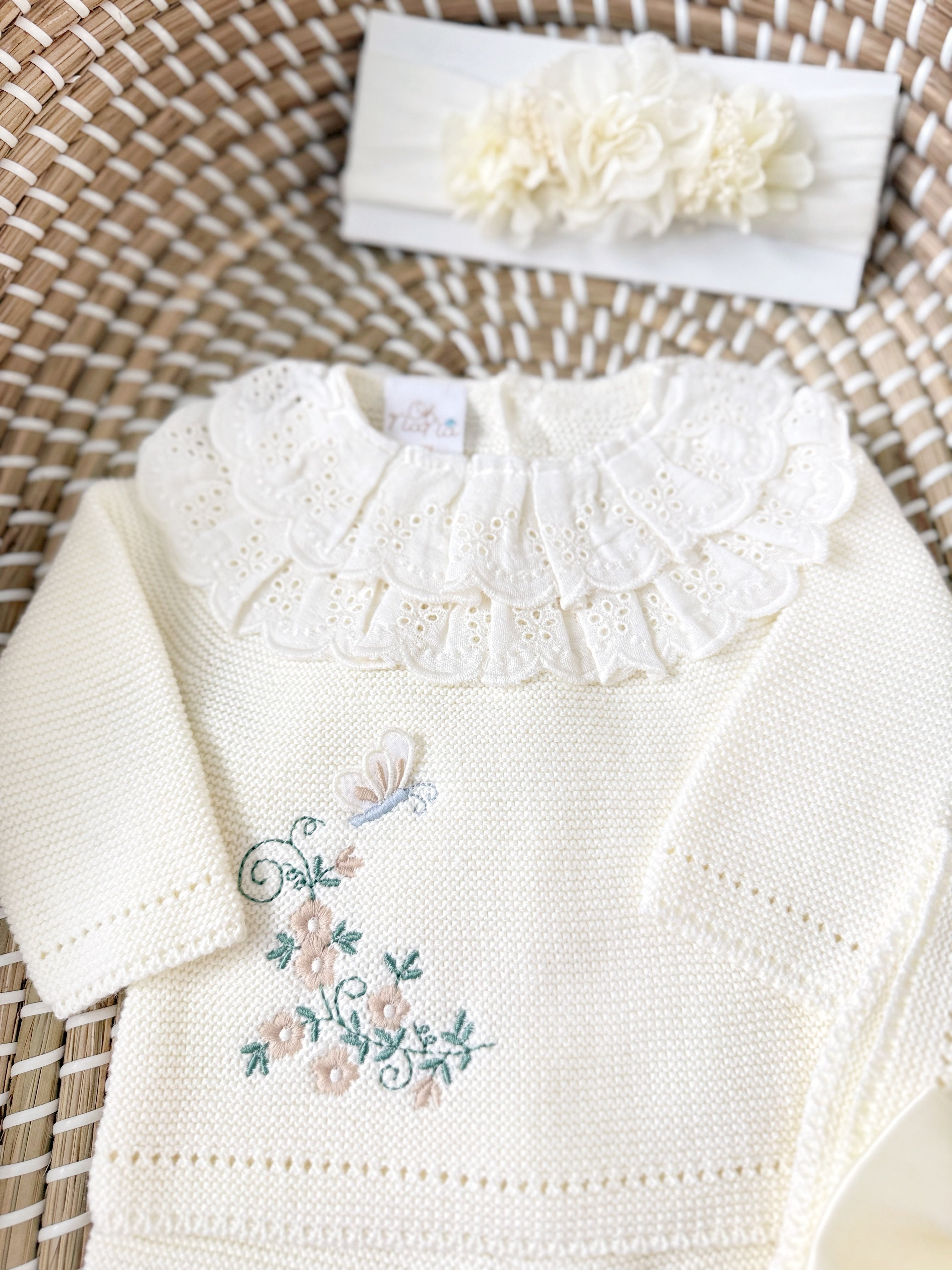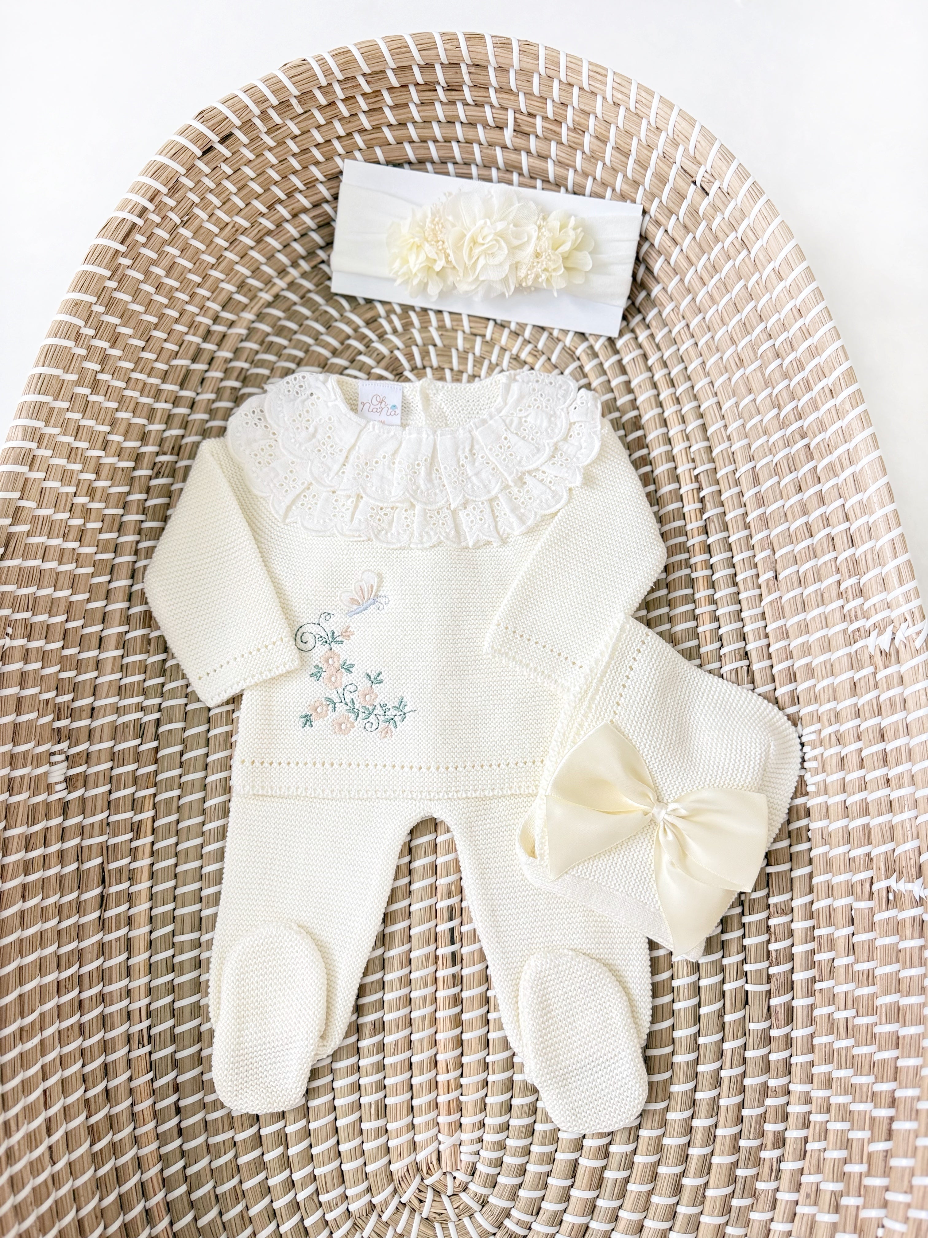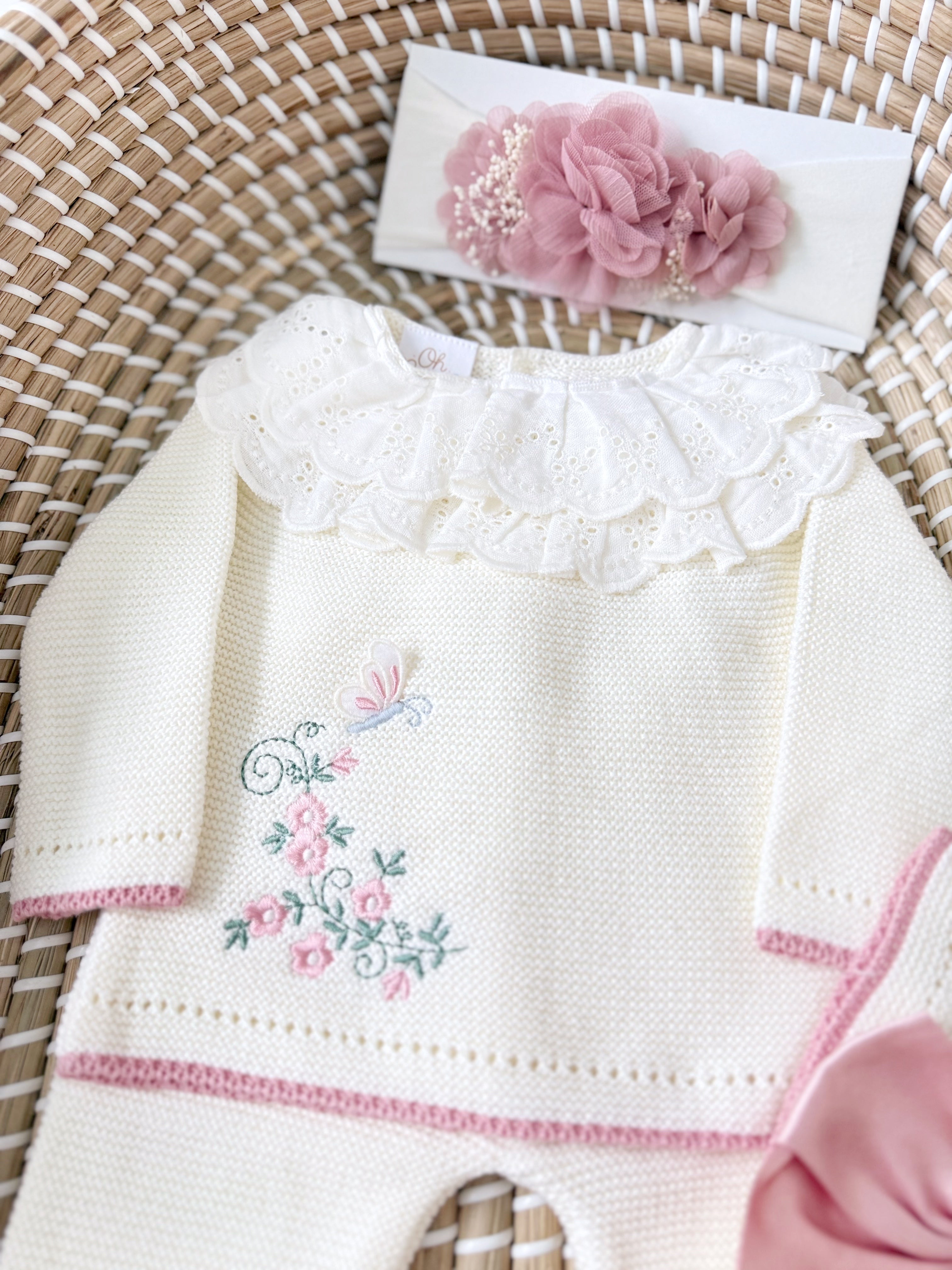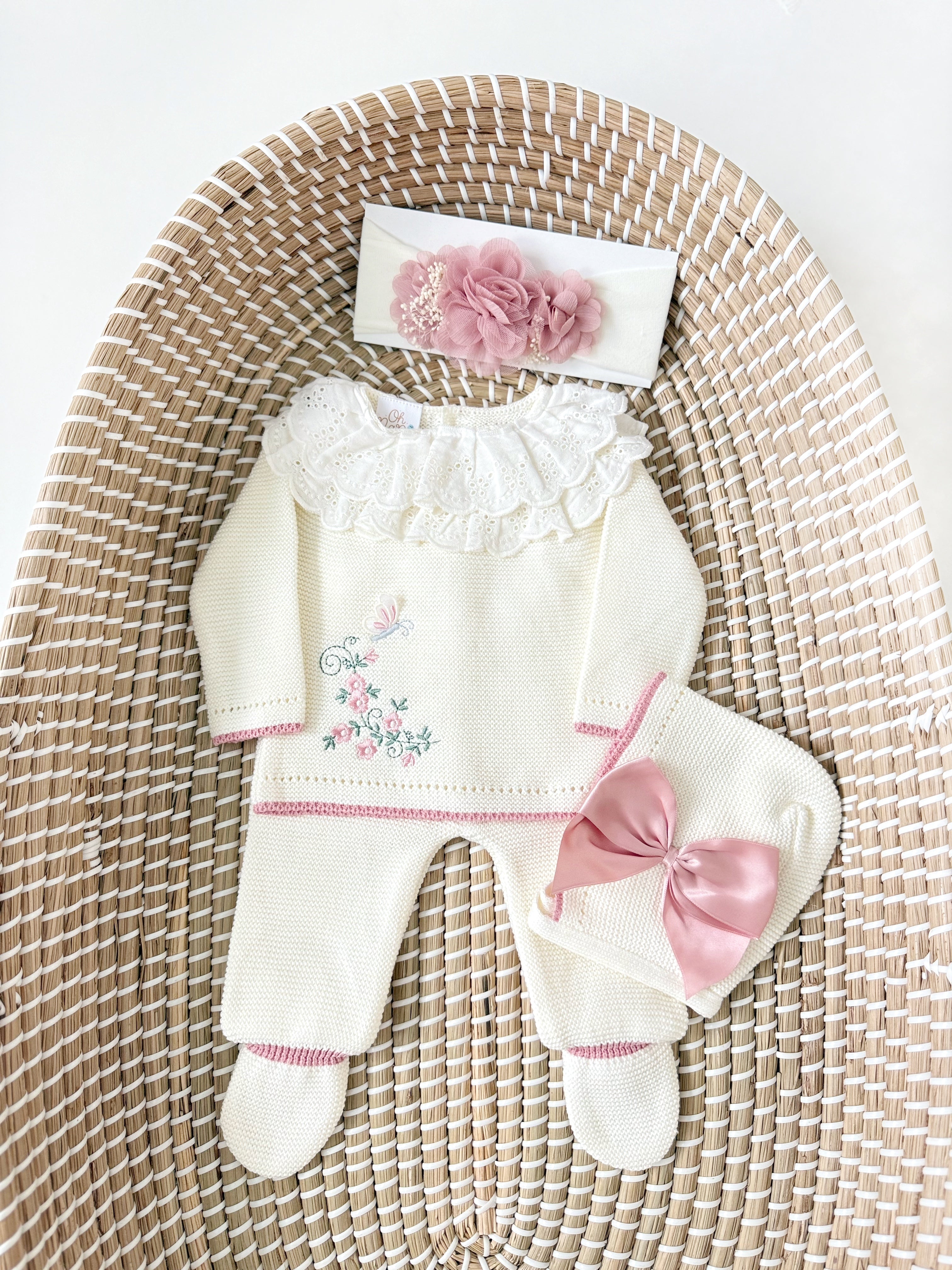 Butterfly Three Piece Knitted Outfit + Headband (Ivory/Dusty Pink)