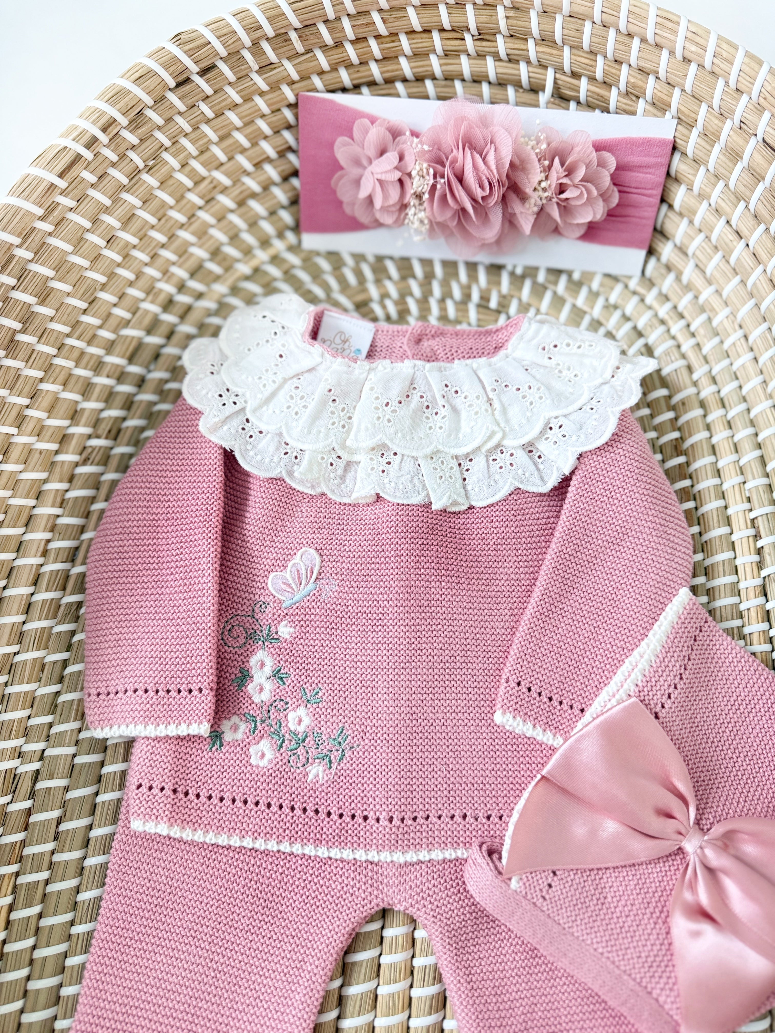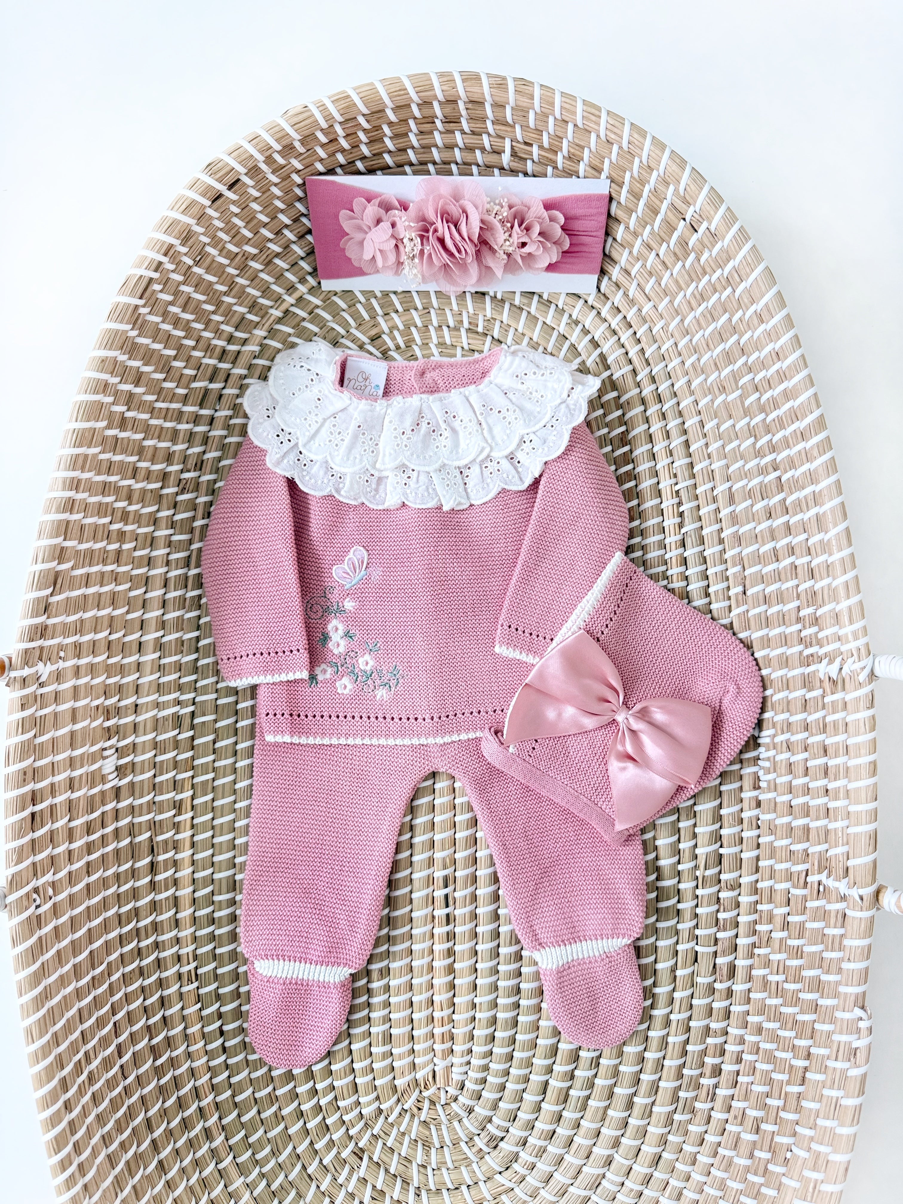 Butterfly Three Piece Knitted Outfit + Headband (Dusty Pink/Ivory)