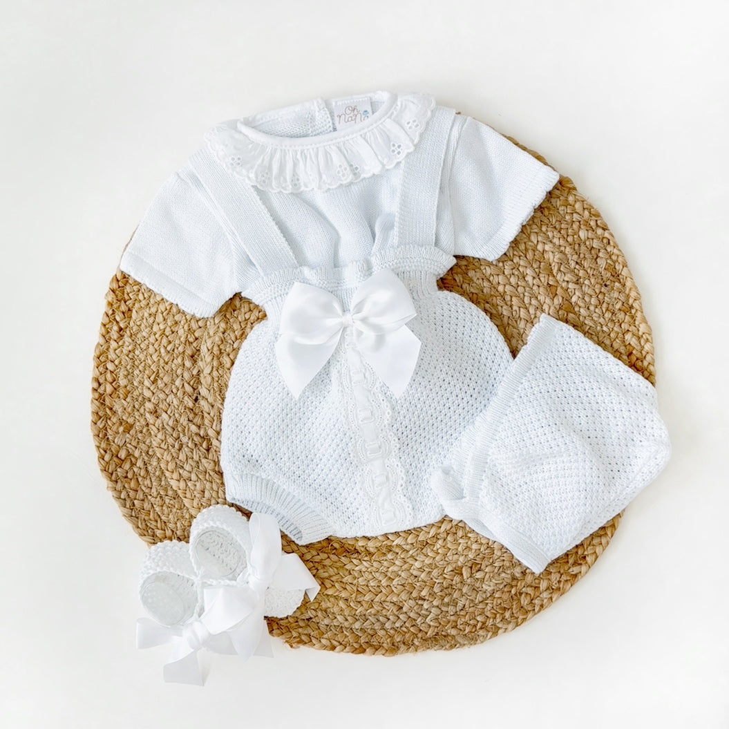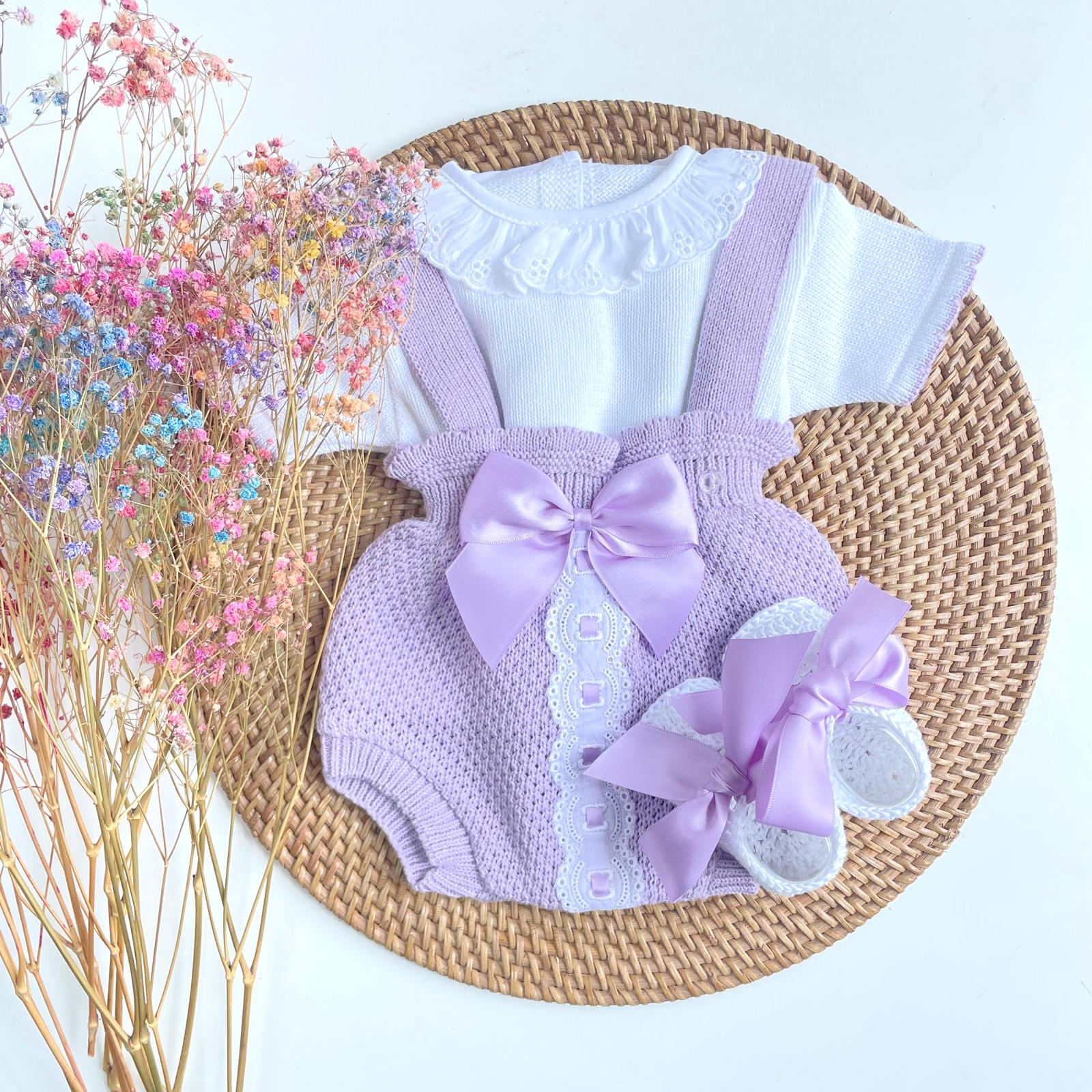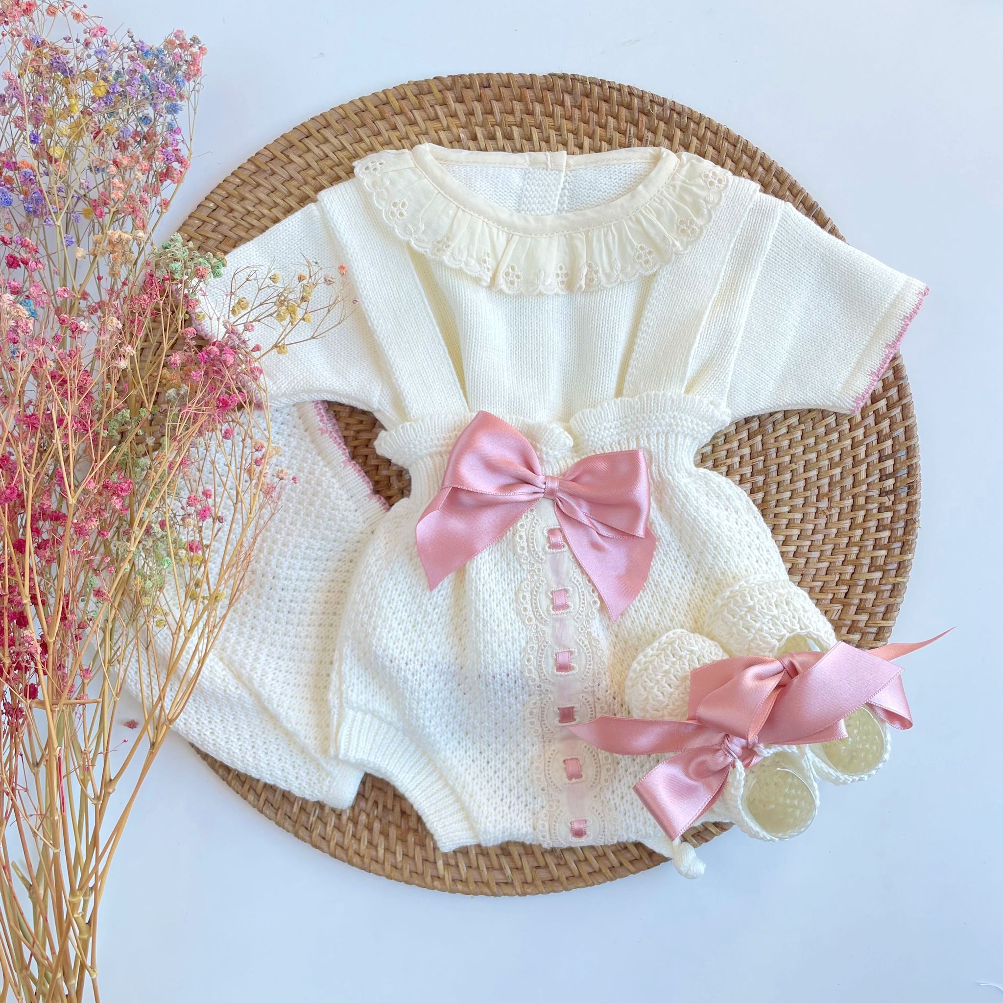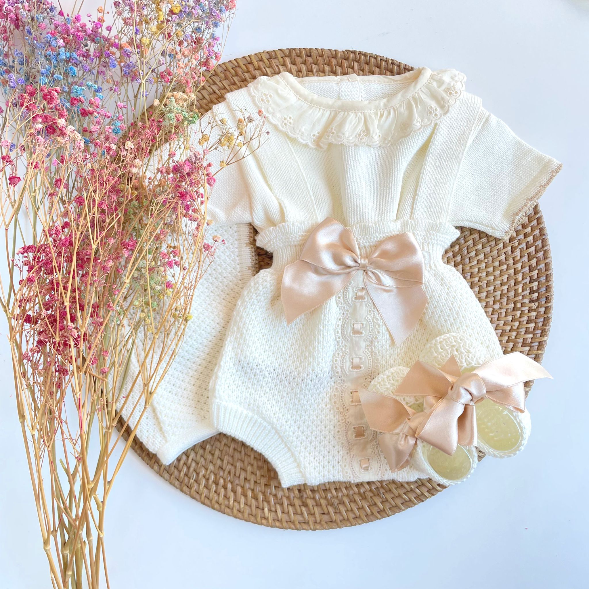 - Four pieces are included: Romper, shirt, knitted shoes and bonnet