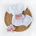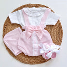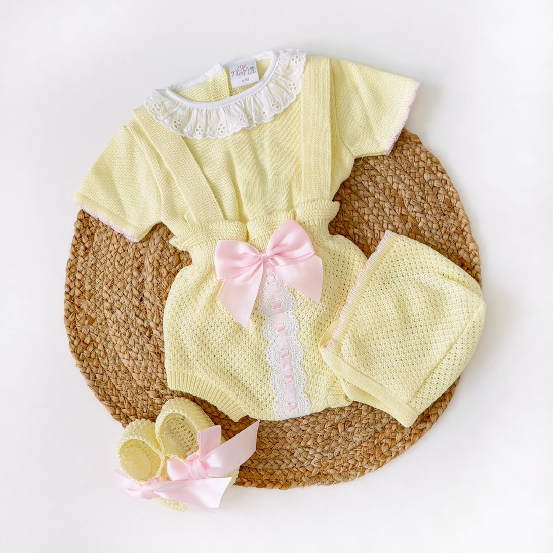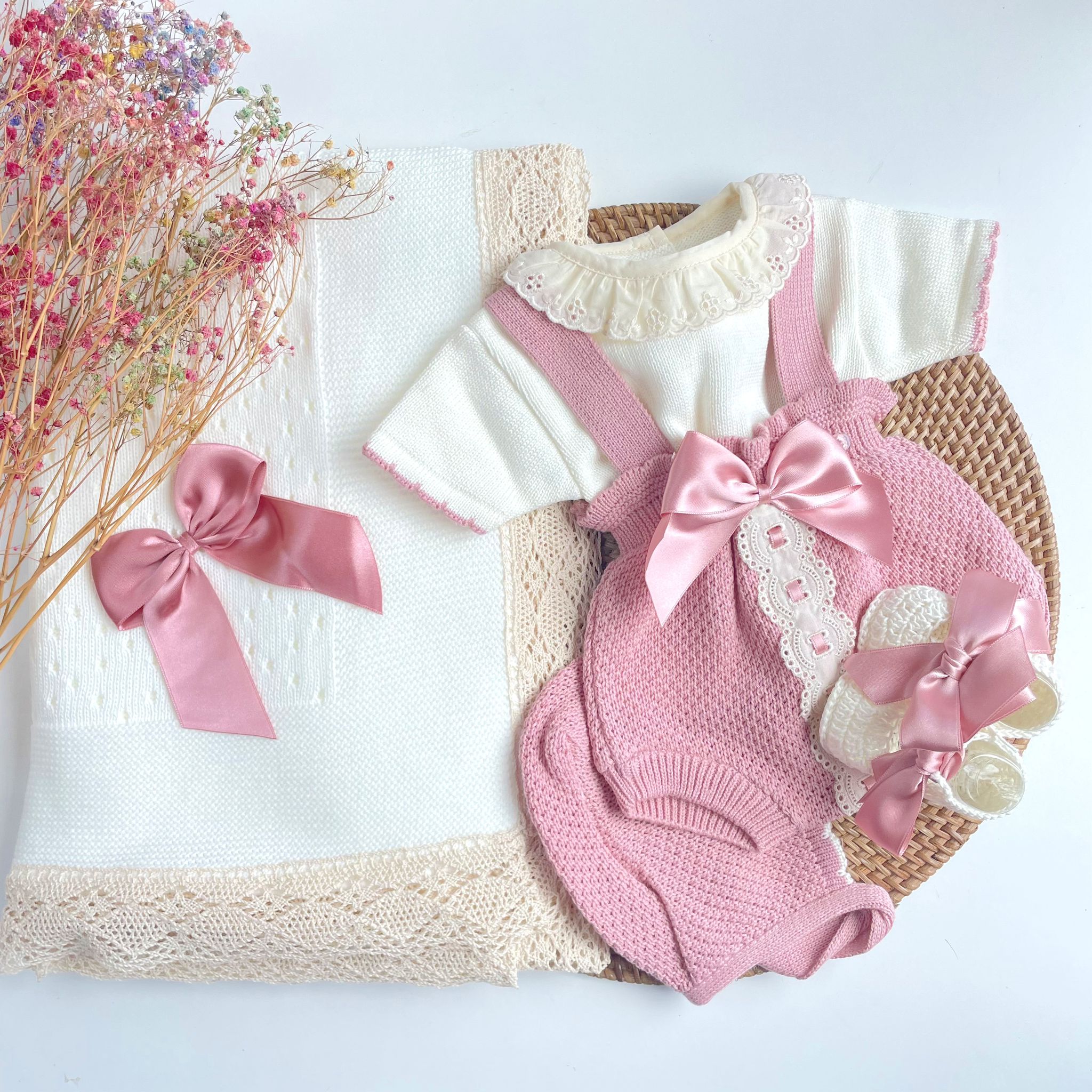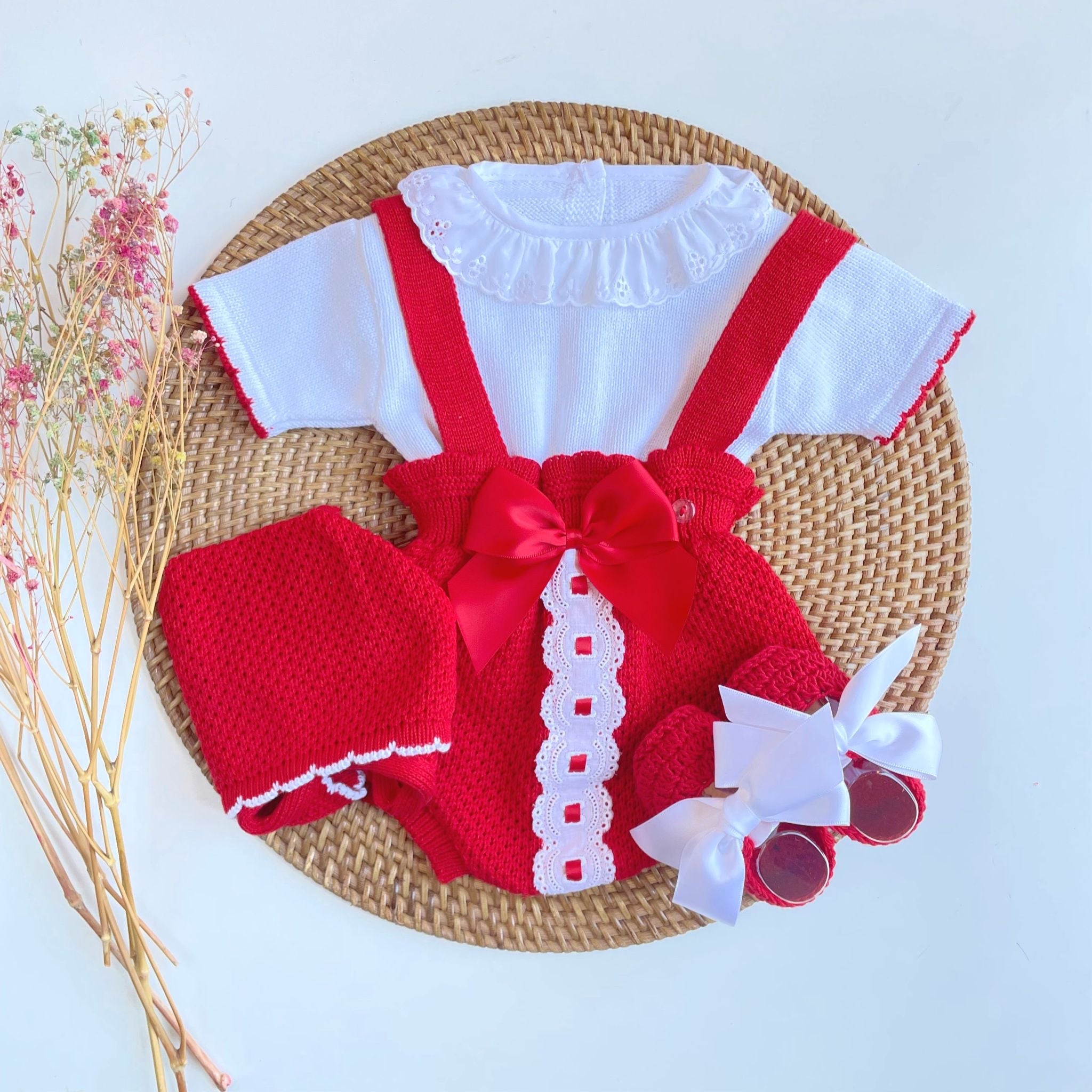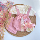 - Four pieces are included: Romper, shirt, knitted shoes and bonnet