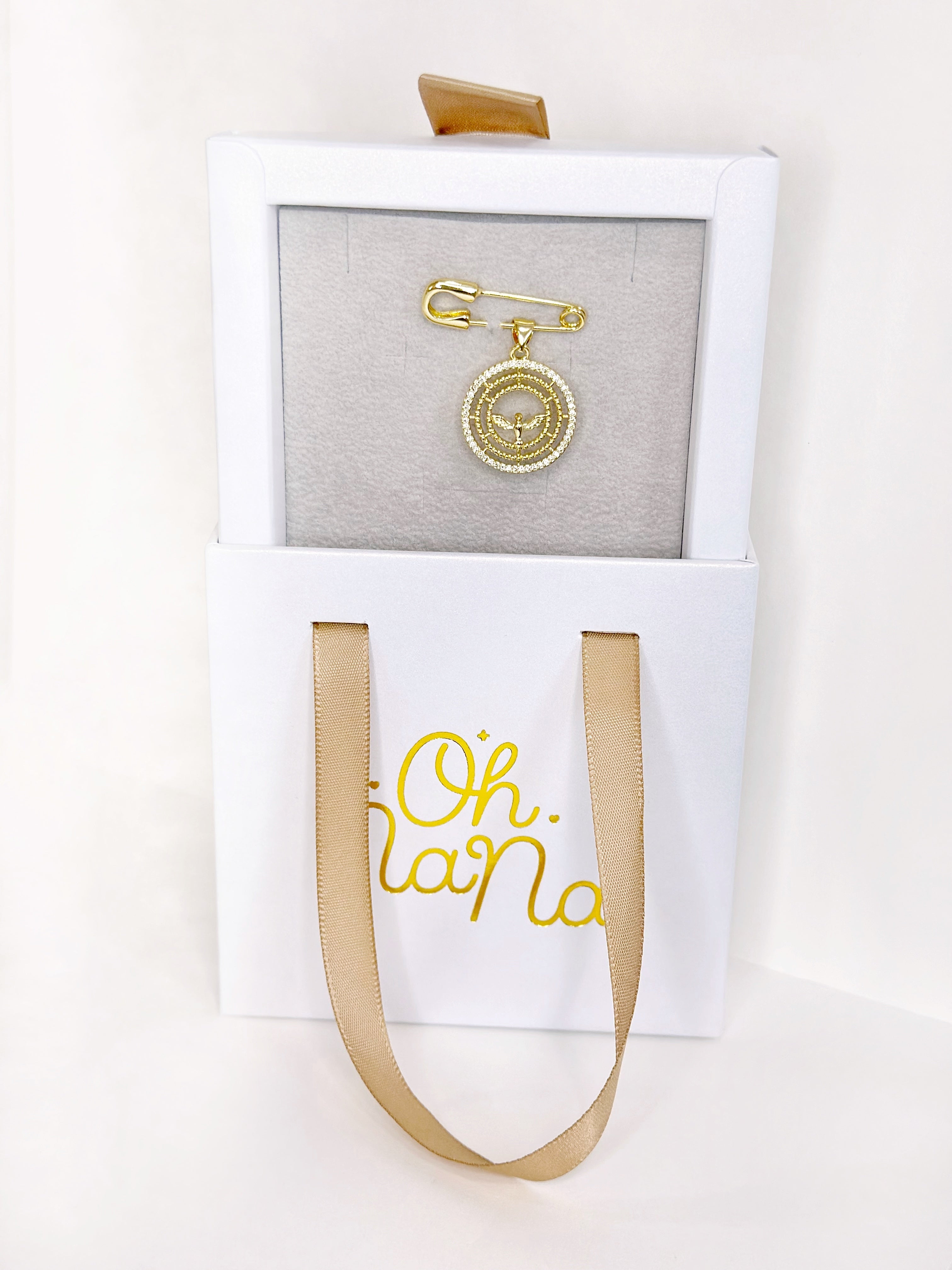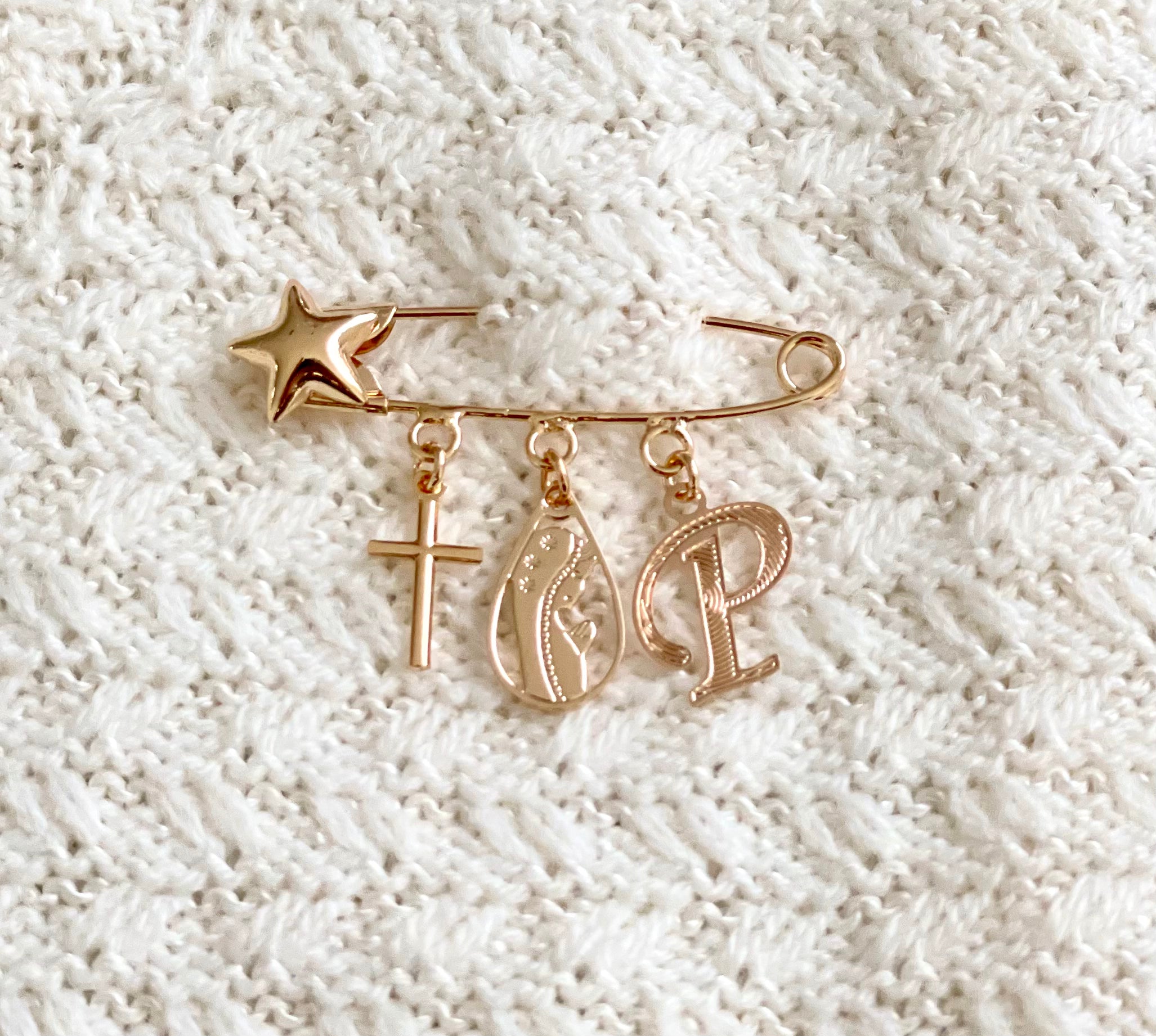 18k Gold Plated Safety Pin Brooch (Dios Me Bendiga with Letter)
