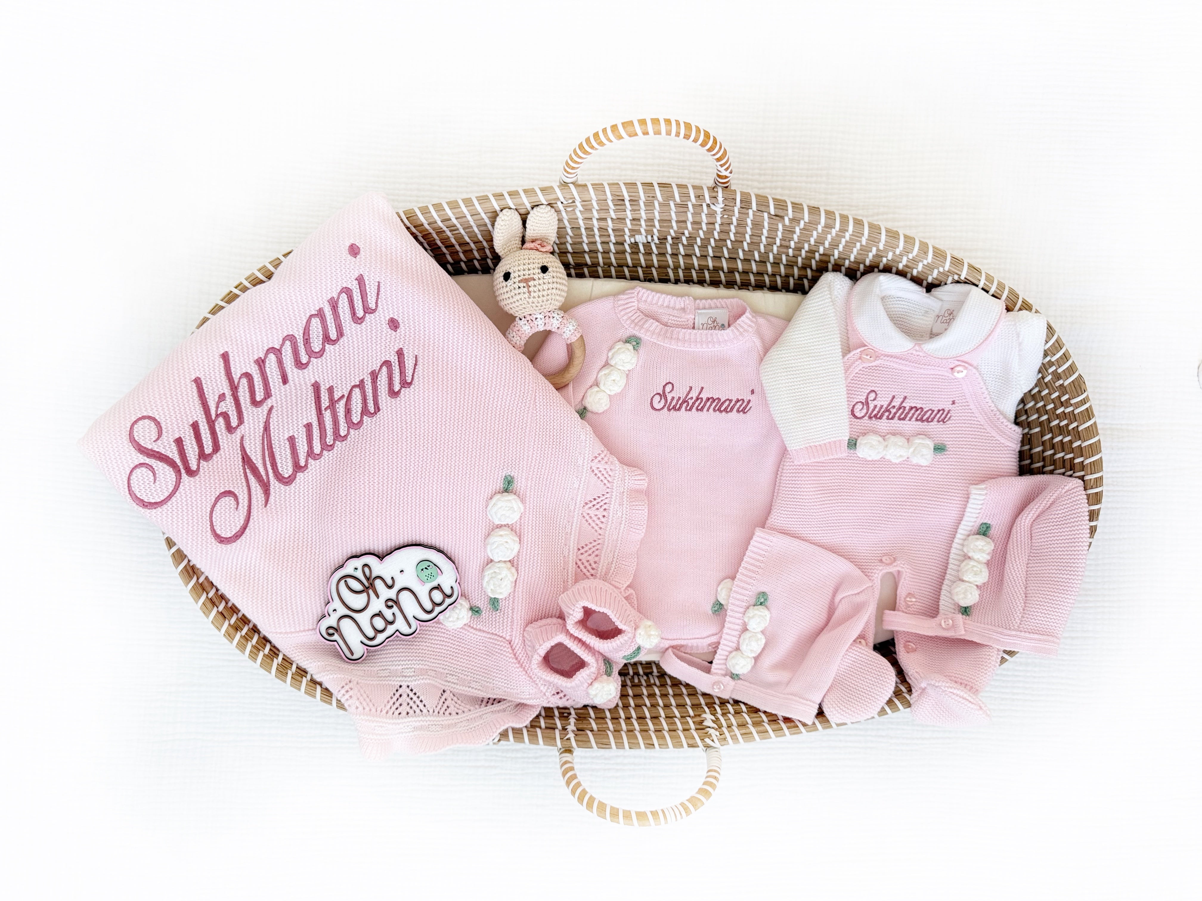 - Two Outfits, Personalized Blanket and Rattle (Chloe 4 Piece Knitted Outfit Light Pink/White, Chloe Three Piece Knitted Outfit Light Pink/White, Personalized Chloe Knitted Blanket Light Pink/White and Matching Rattle.