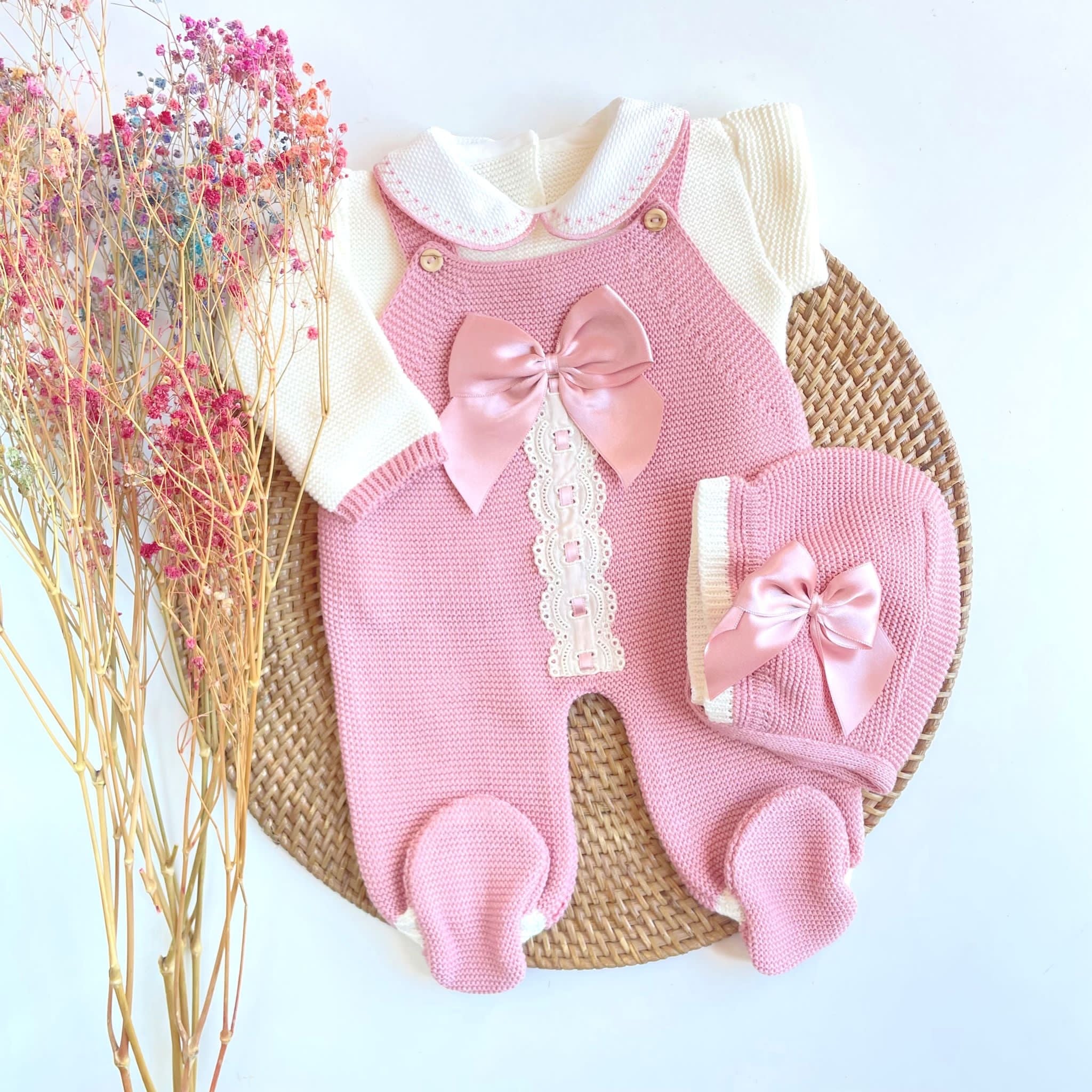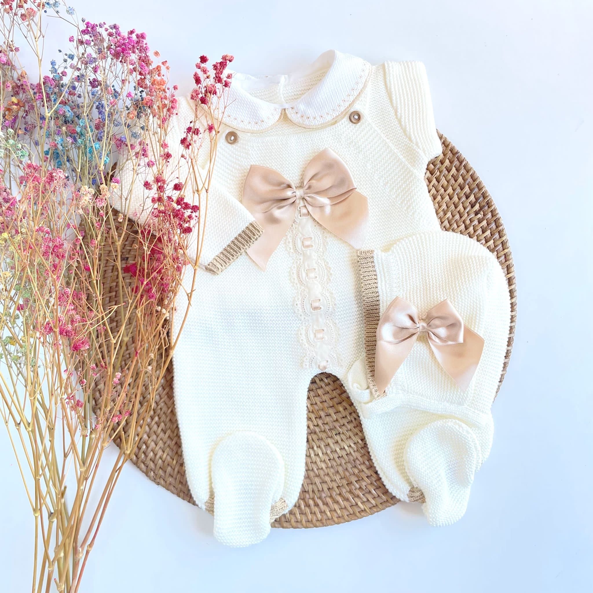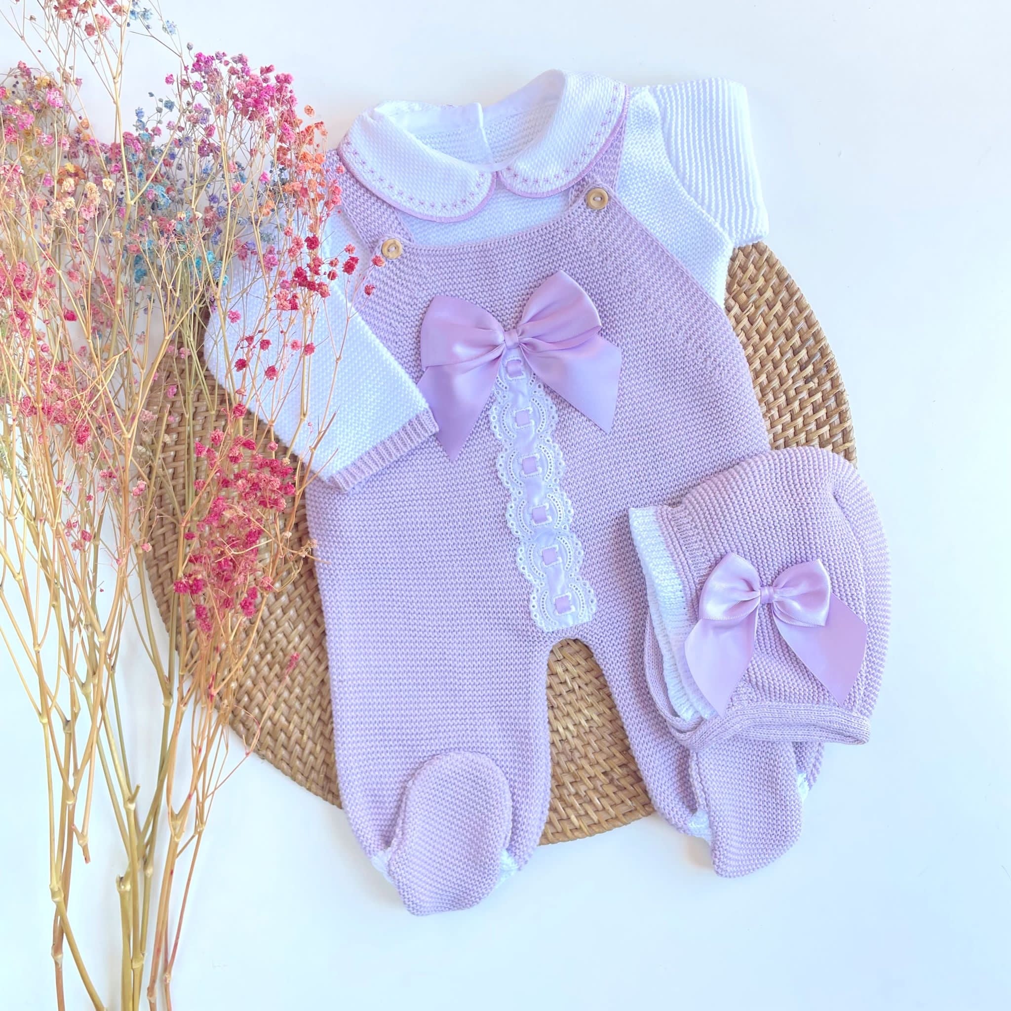 - Four pieces are included: Romper, shirt, knitted shoes and bonnet