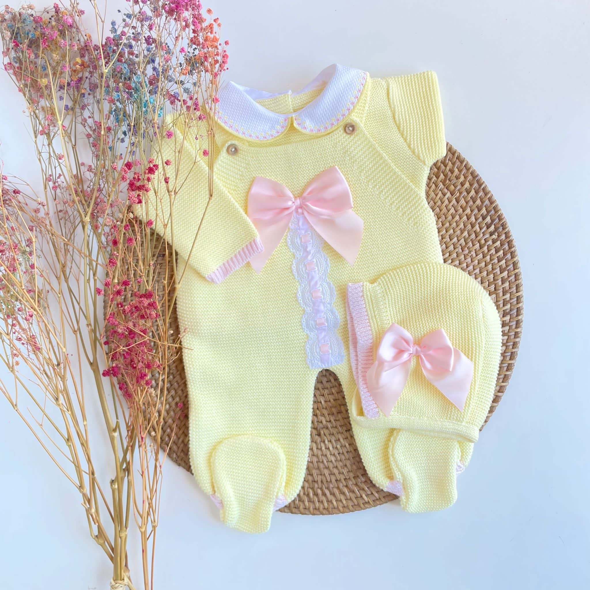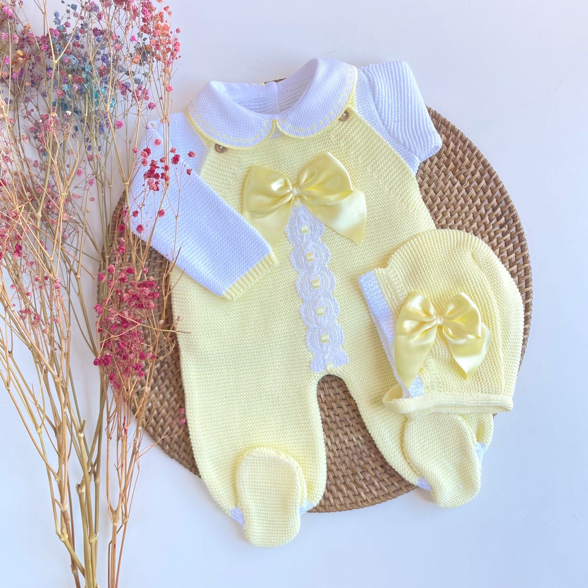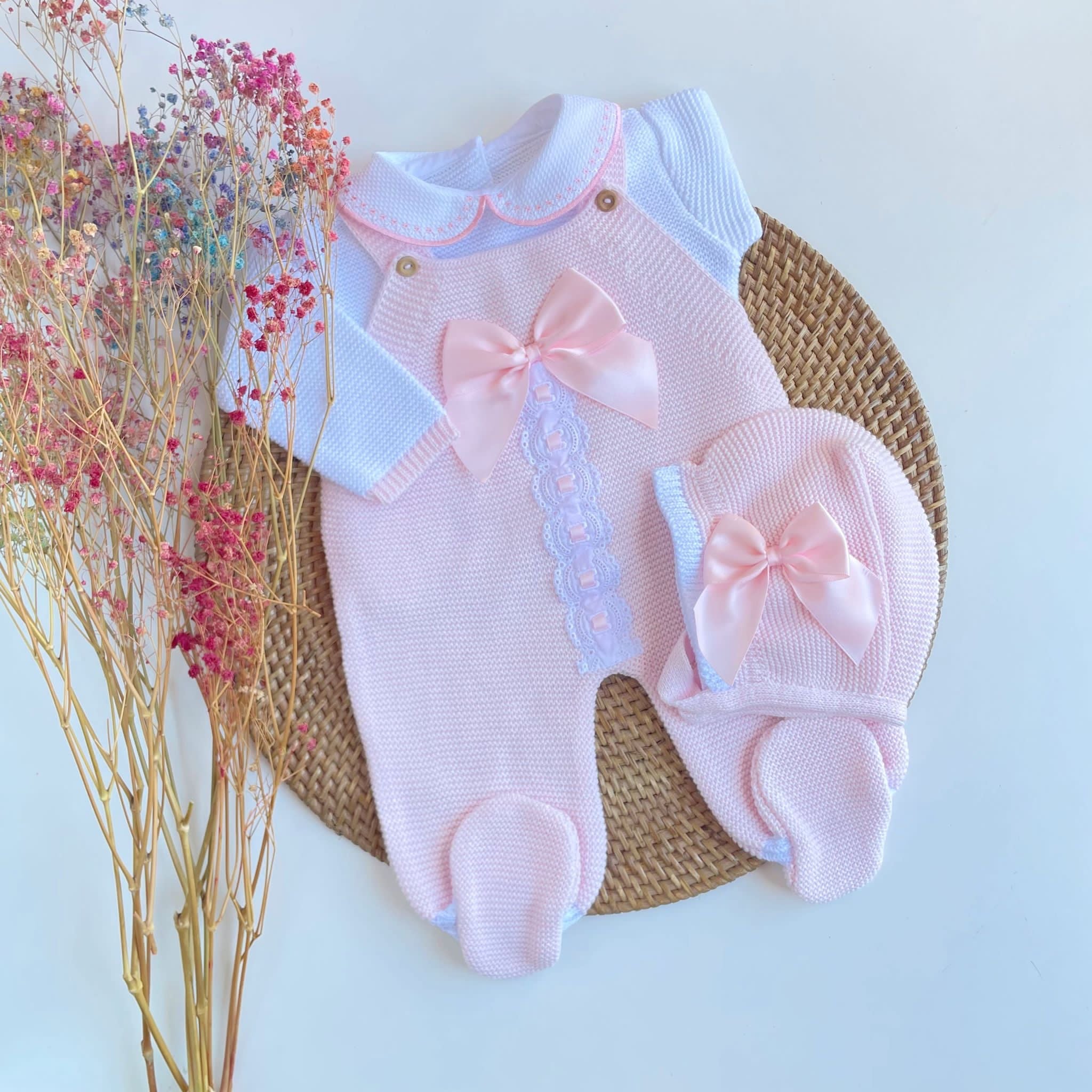 - Four pieces are included: Romper, shirt, knitted shoes and bonnet