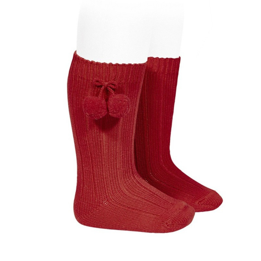 Warm Cotton Rib Knee-High Socks with Pompoms (Red)
