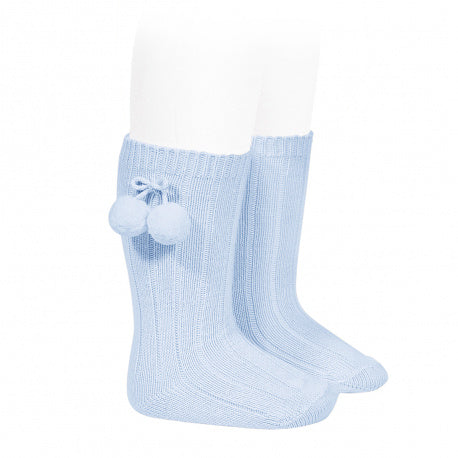 Warm Cotton Rib Knee-High Socks with Pompoms (Baby Blue)