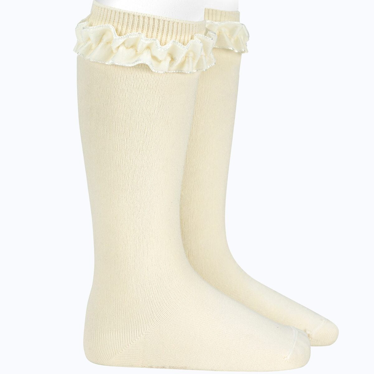 Knee High Cotton Socks with Velvet Ruffle Cuff (Cream)