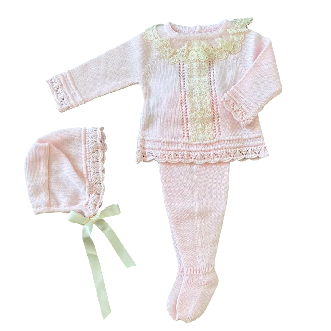 Three pieces are included: Sweater, pants and bonnet
