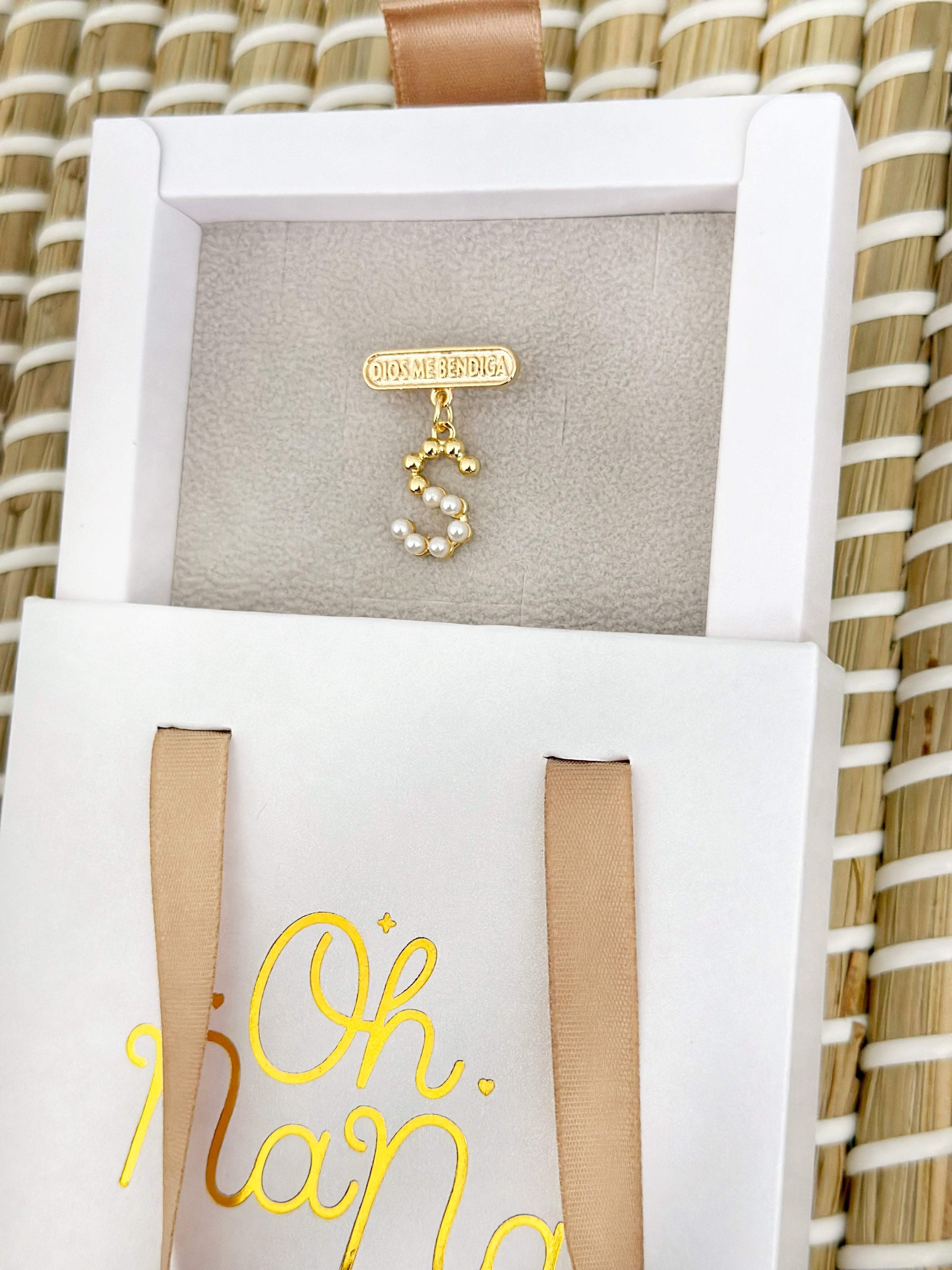 18k Gold Plated Safety Pin Brooch (Dios Me Bendiga with Letter)