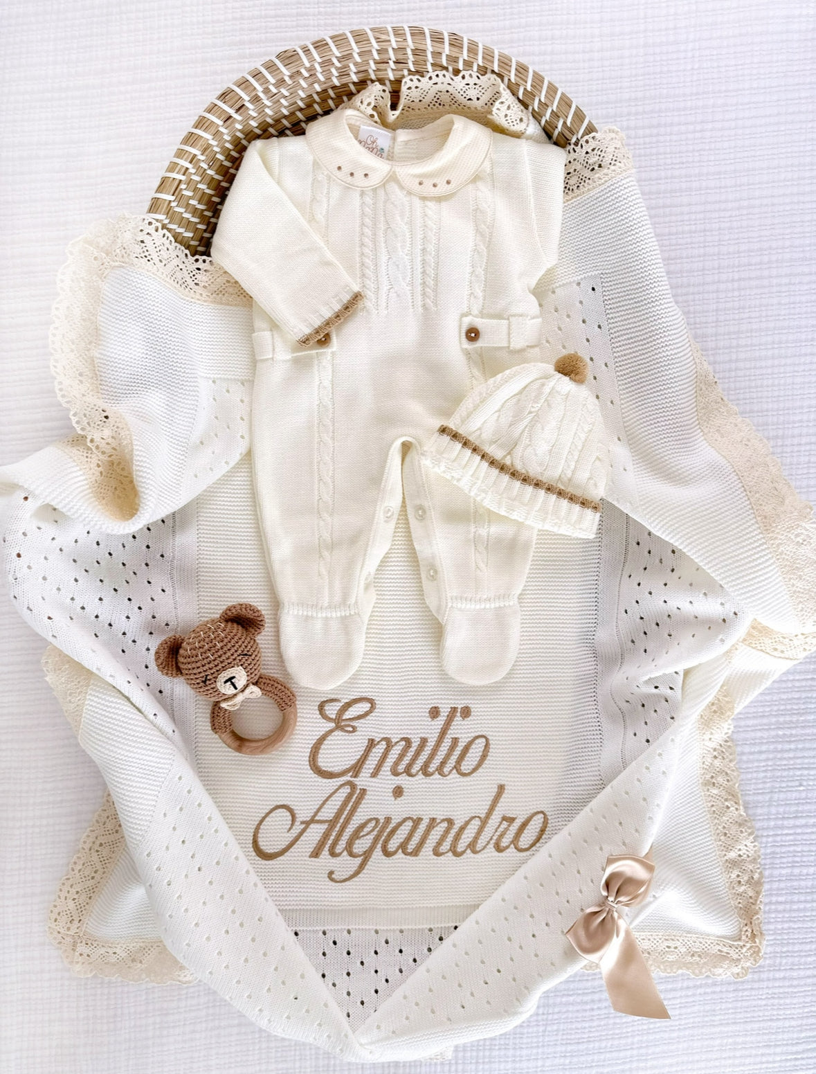 - Two Outfits, Personalized Blanket and Bear Rattle (Paul 4 Piece Knitted Outfit Beige-Ivory, Jordan Two Piece Knitted Outfit Ivory-Beige, Personalized Lovely Knitted Blanket Ivory and Matching Rattle.