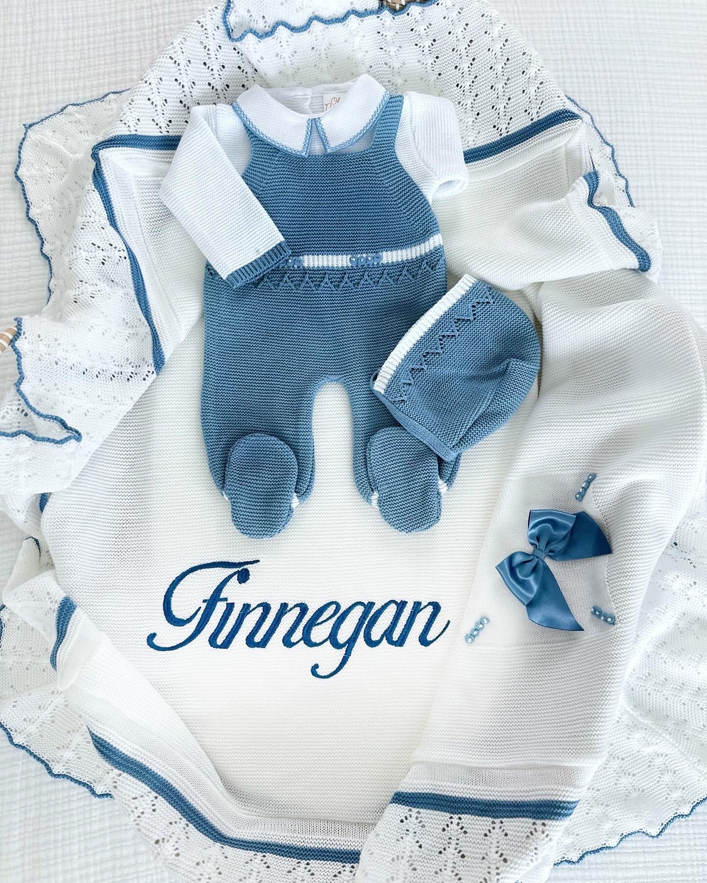 - Four pieces are included: sweater, romper, bonnet and personalized blanket