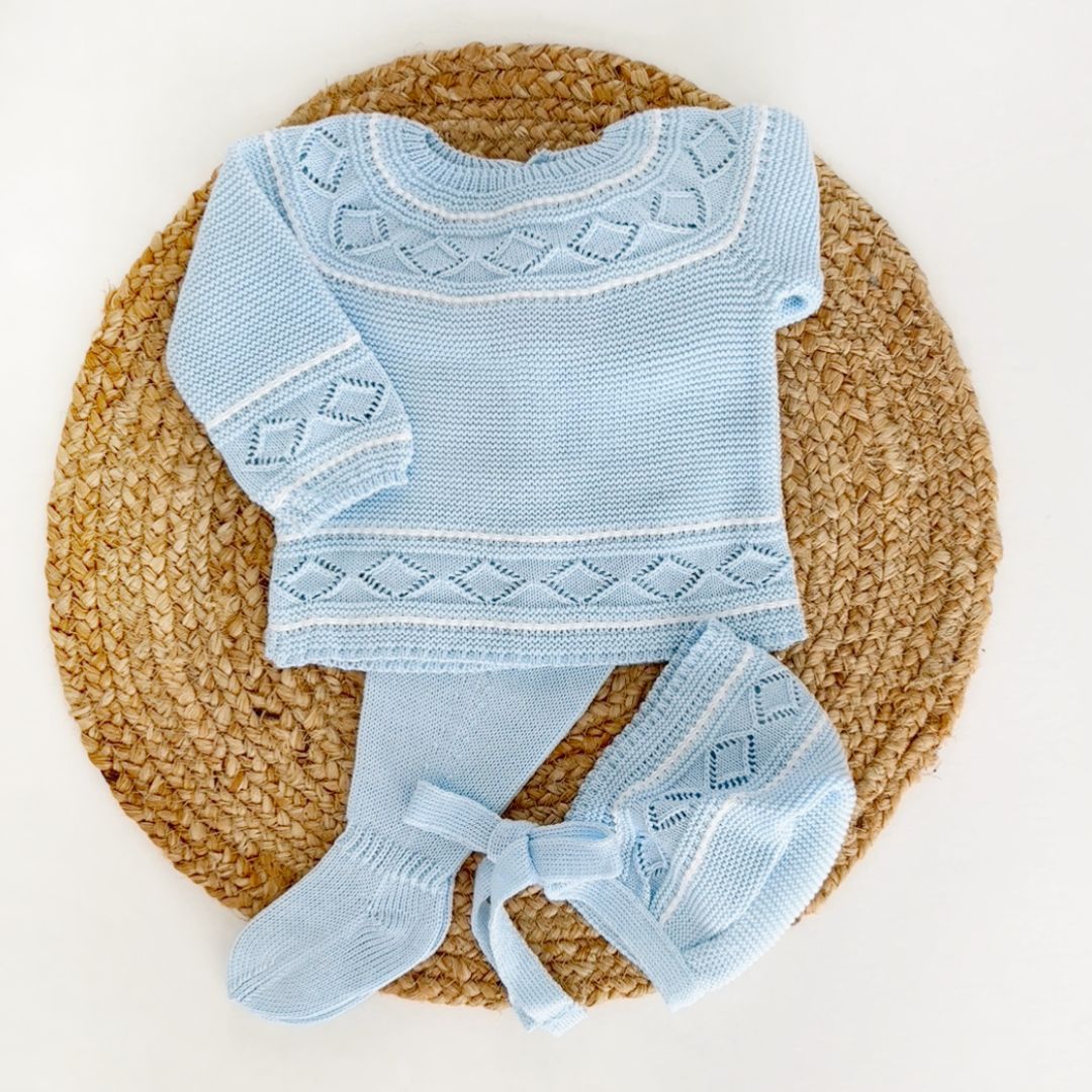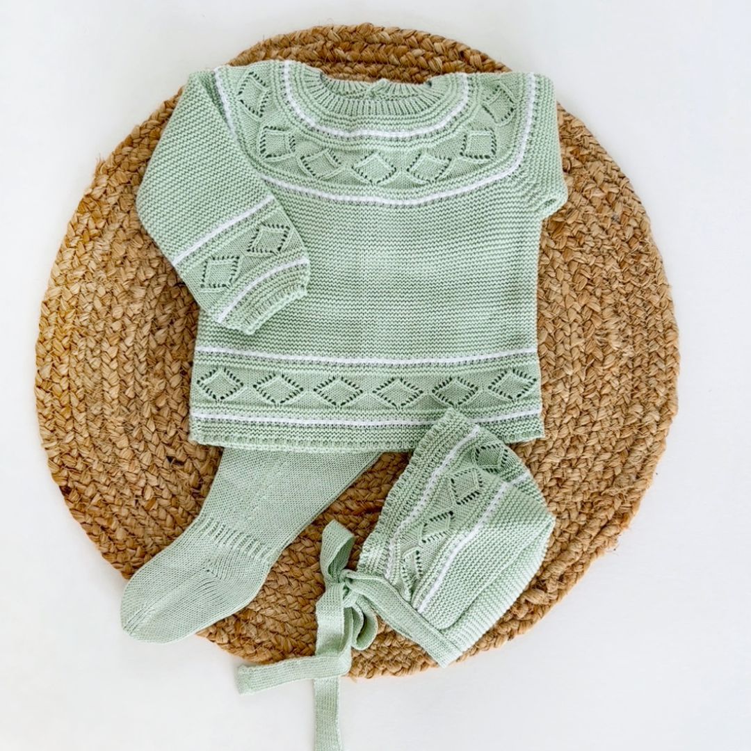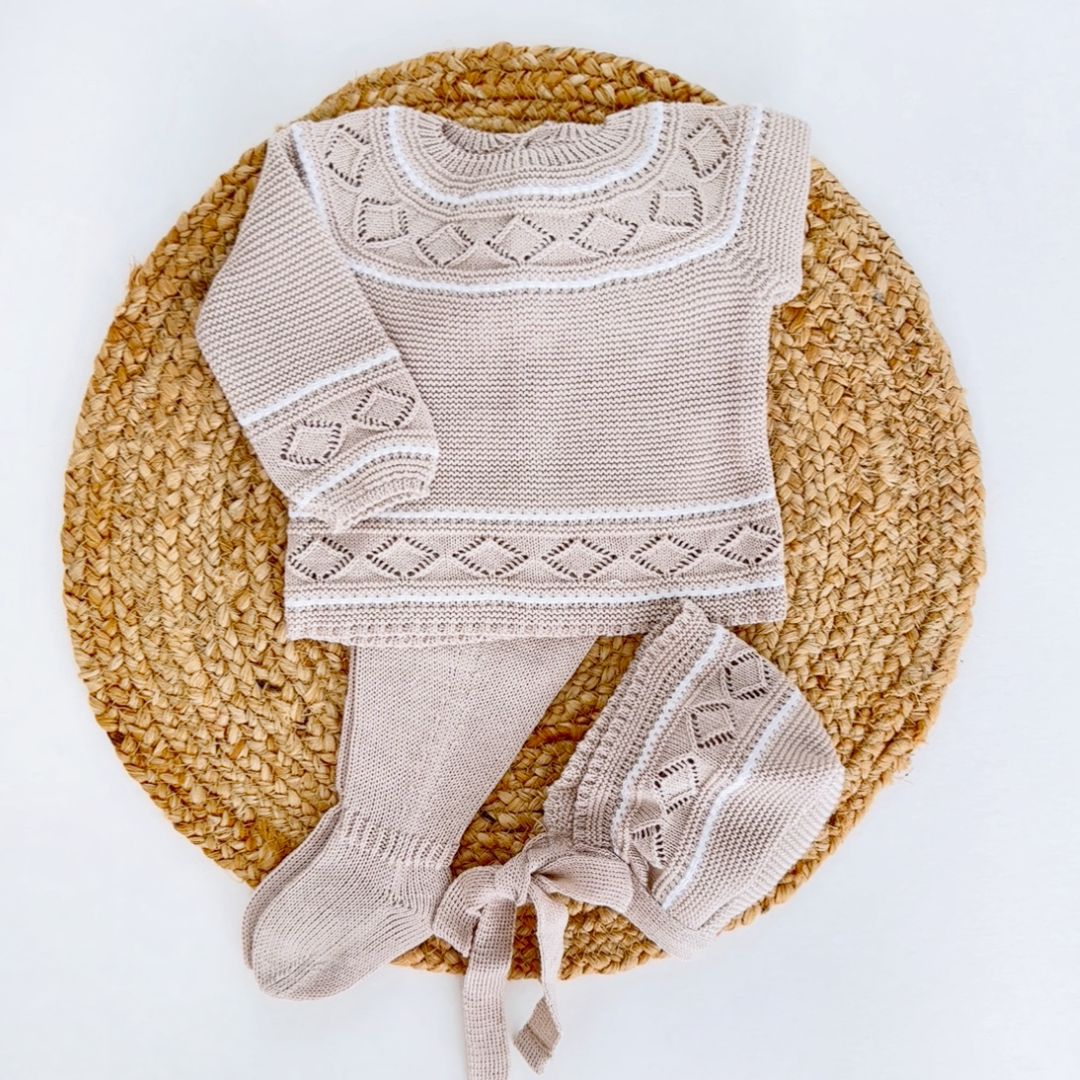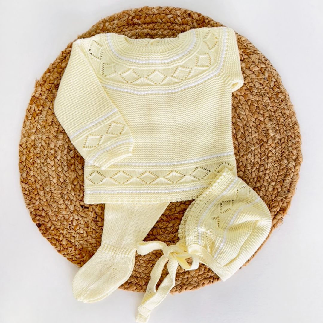 • Three pieces are included: Sweater, pants and bonnet