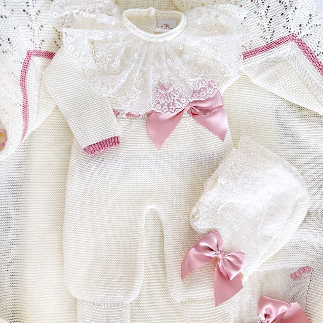 • Knitted Jumpsuit, Bonnet and Blanket.